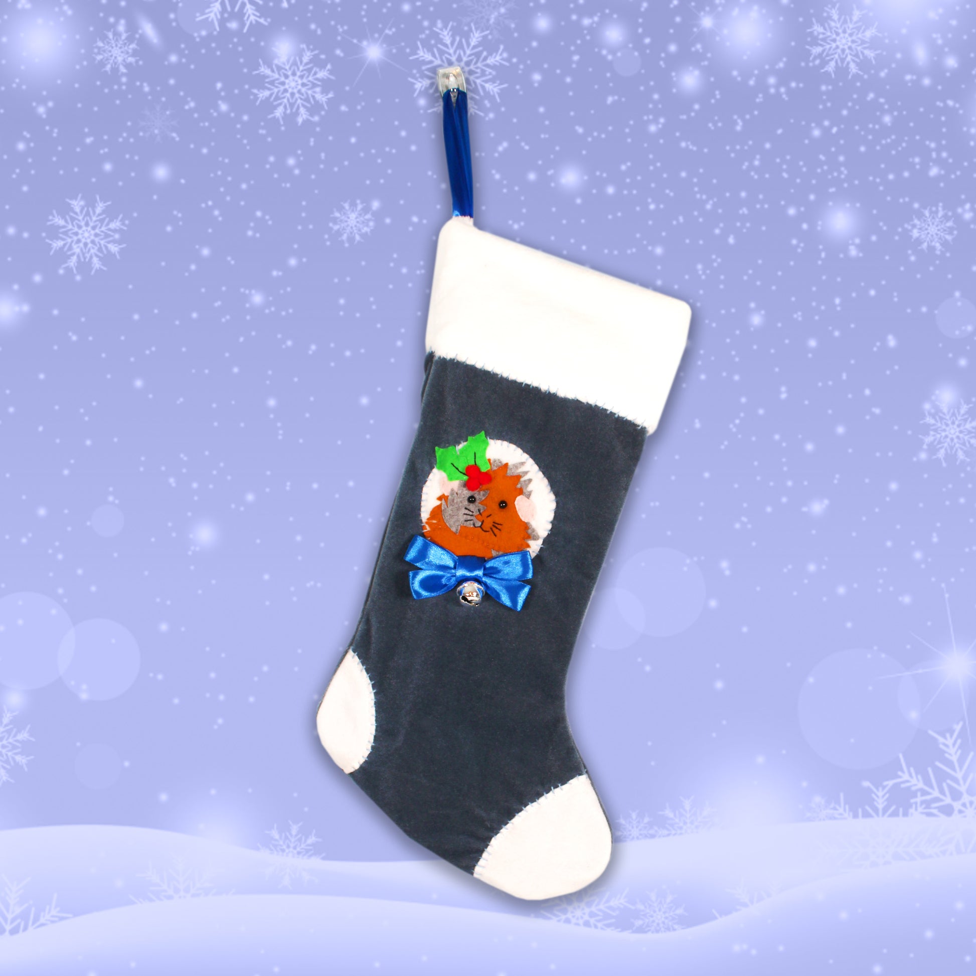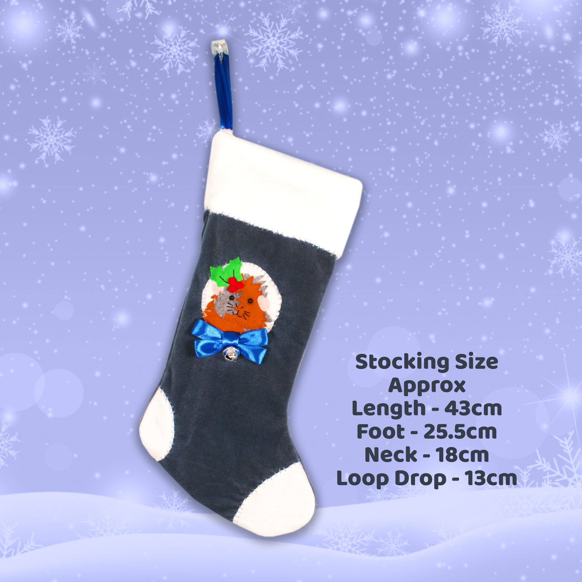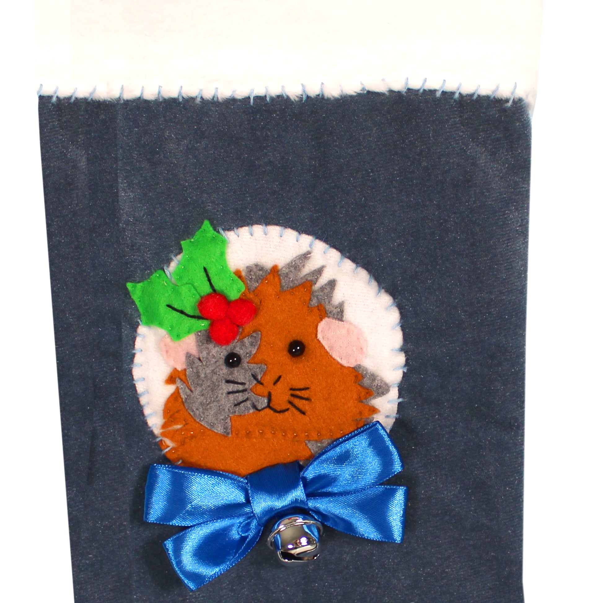 Handcrafted Abyssinian brown and grey guinea pig Christmas stocking has been lovingly handmade with recycled luxury navy blue velvet fabric, white super soft cuddle plush fleece for the neck and white fleece for the feet tips.