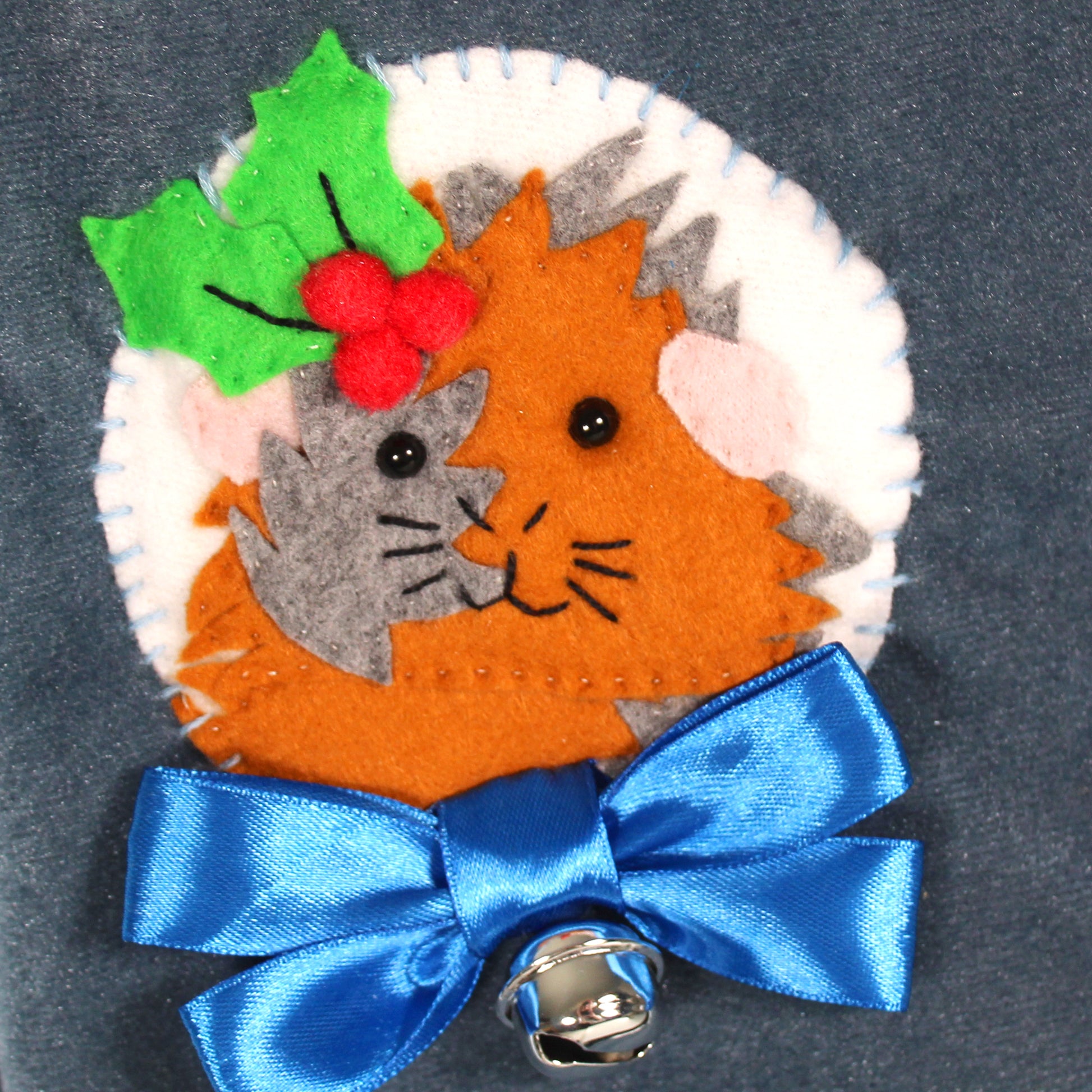 • Luxury navy blue velvet fabric, white cuddle soft fleece, white fleece tips of foot, bell and ribbon.