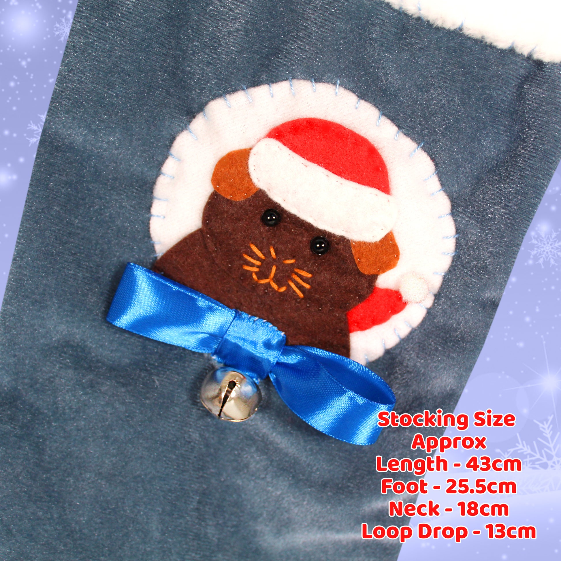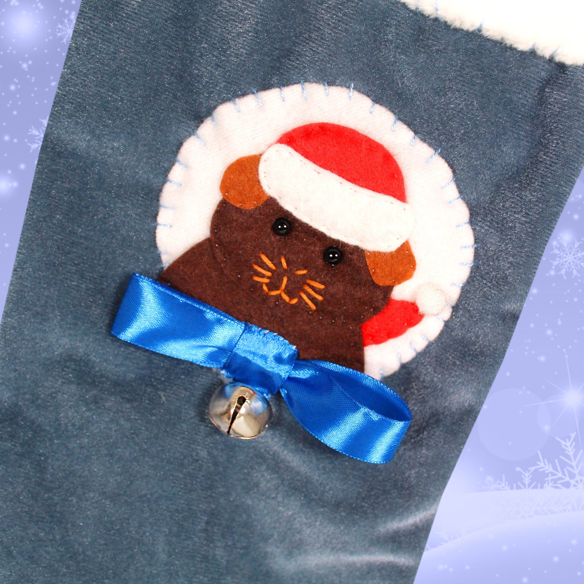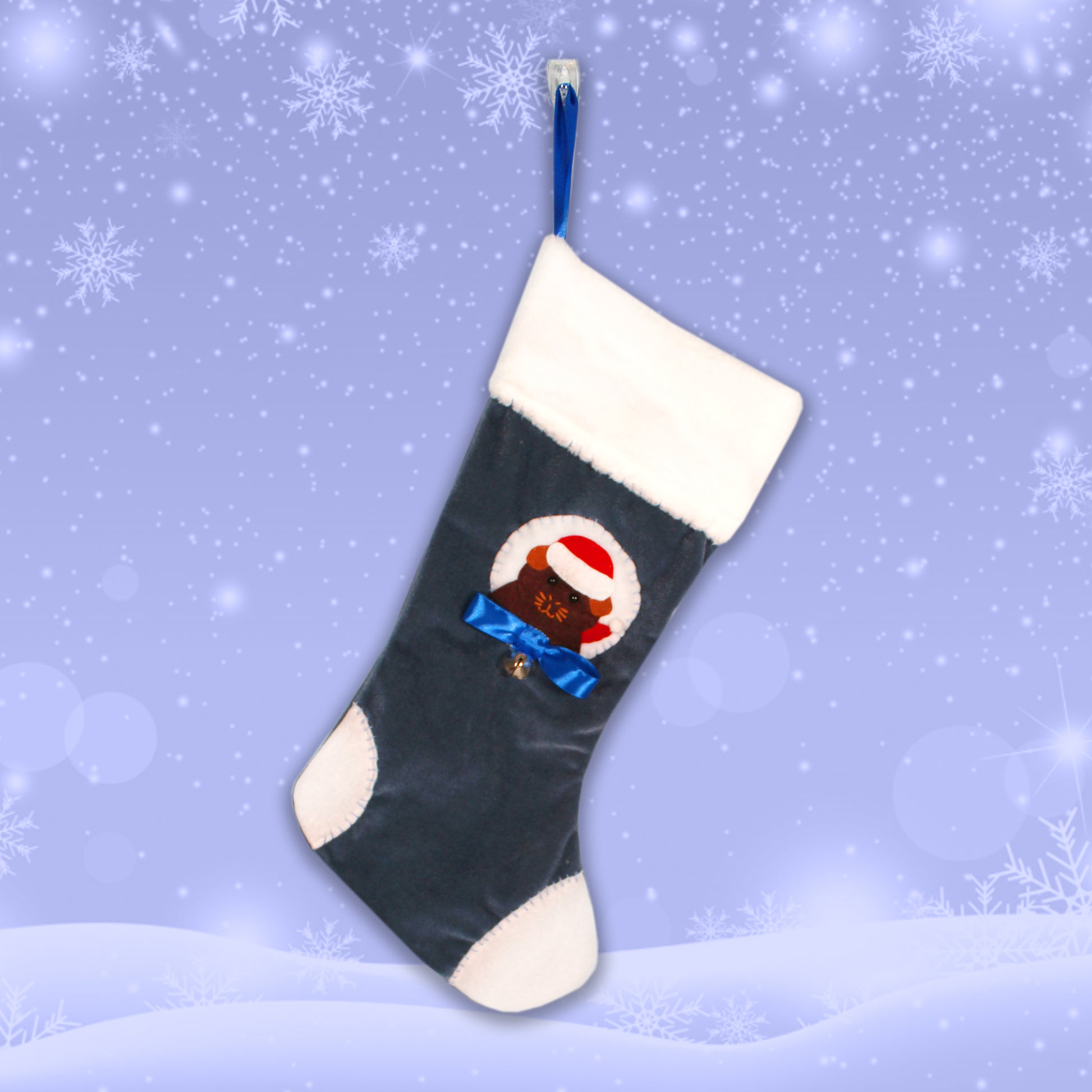 Handcrafted brown guinea pig Christmas stocking has been lovingly handmade with recycled luxury navy blue velvet fabric, white super soft cuddle plush fleece for the neck and white fleece for the feet tips.