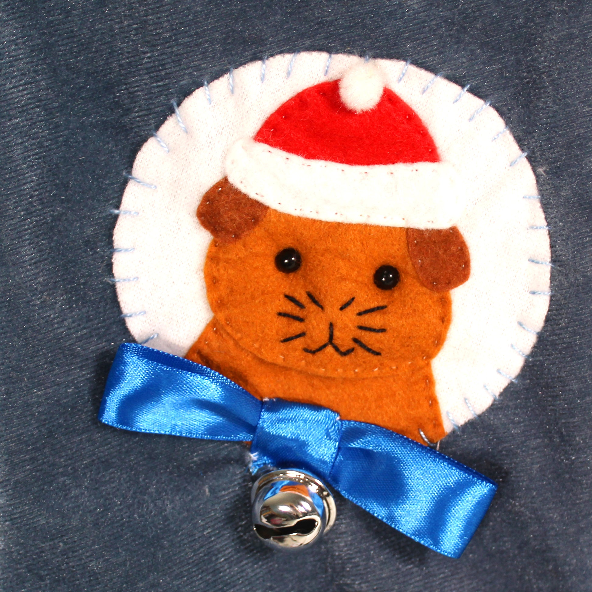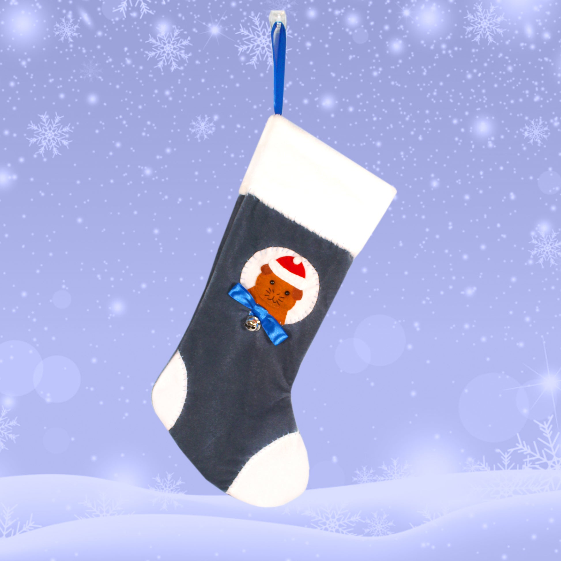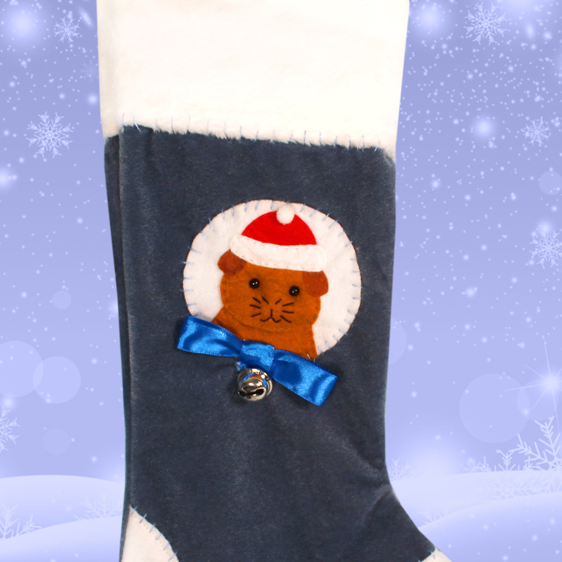 Handcrafted ginger guinea pig Christmas stocking has been lovingly handmade with recycled luxury navy blue velvet fabric, white super soft cuddle plush fleece for the neck and white fleece for the feet tips.