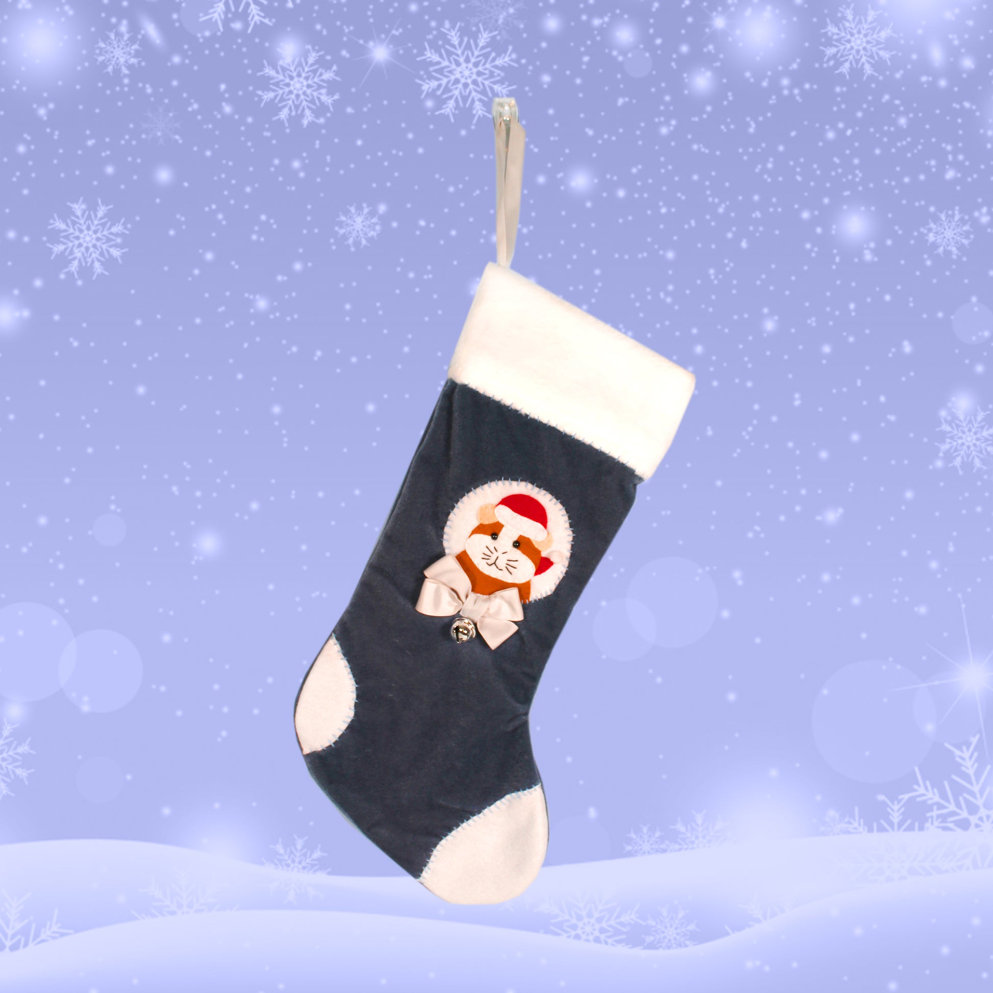 Handcrafted ginger and white guinea pig Christmas stocking has been lovingly handmade with recycled luxury navy blue velvet fabric, white super soft cuddle plush fleece for the neck and white fleece for the feet tips.
