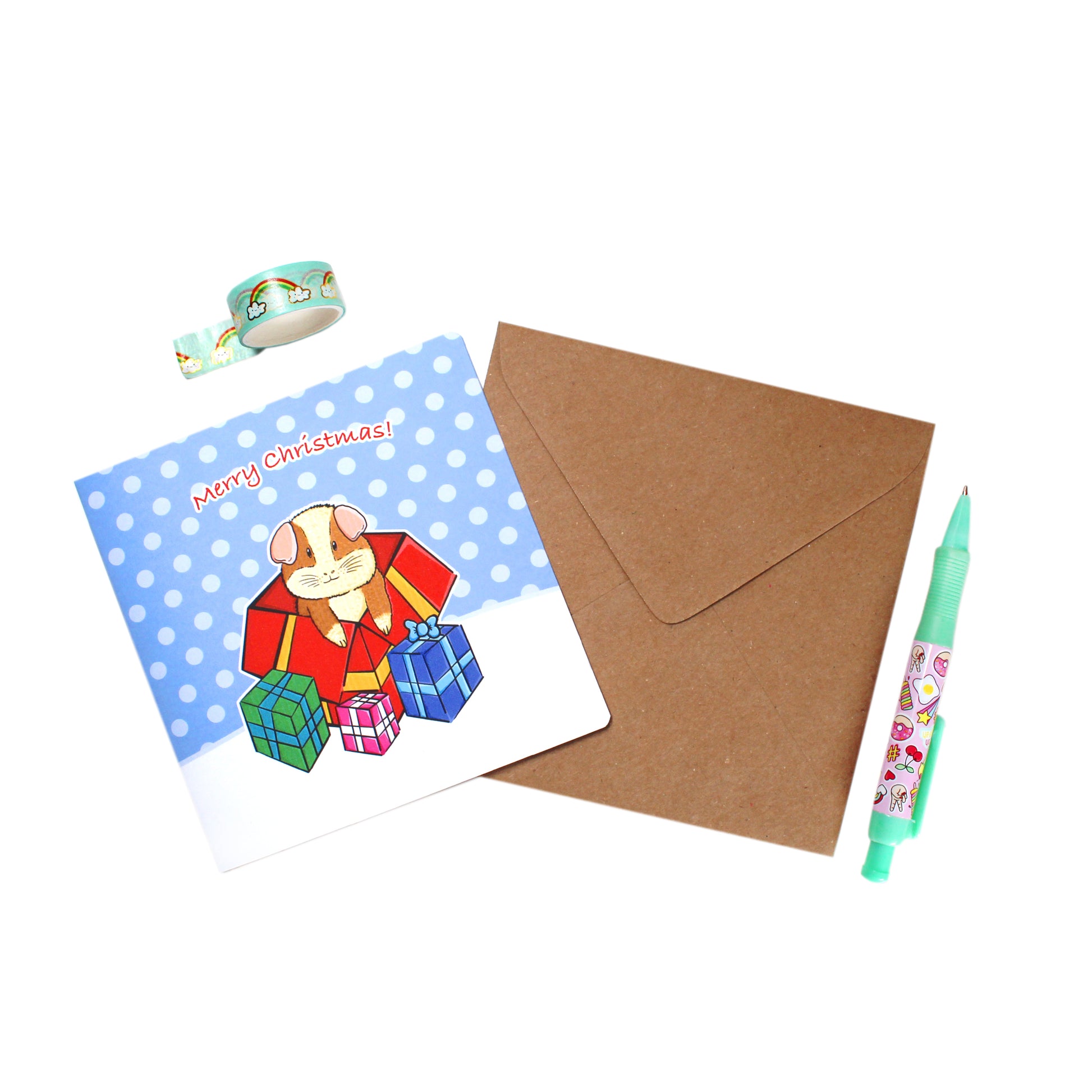 Looking to add a touch of furry joy to your holiday greetings? Our Guinea Pig Christmas Presents Greetings Card is the perfect choice. Hand-illustrated with love in our Yorkshire studio, this Christmas card features an adorable guinea pig popping out of a present, surrounded by smaller gifts. It's not just a card; it's a piece of festive art that will warm the hearts of guinea pig lovers and fans of animal-themed Christmas cards.
