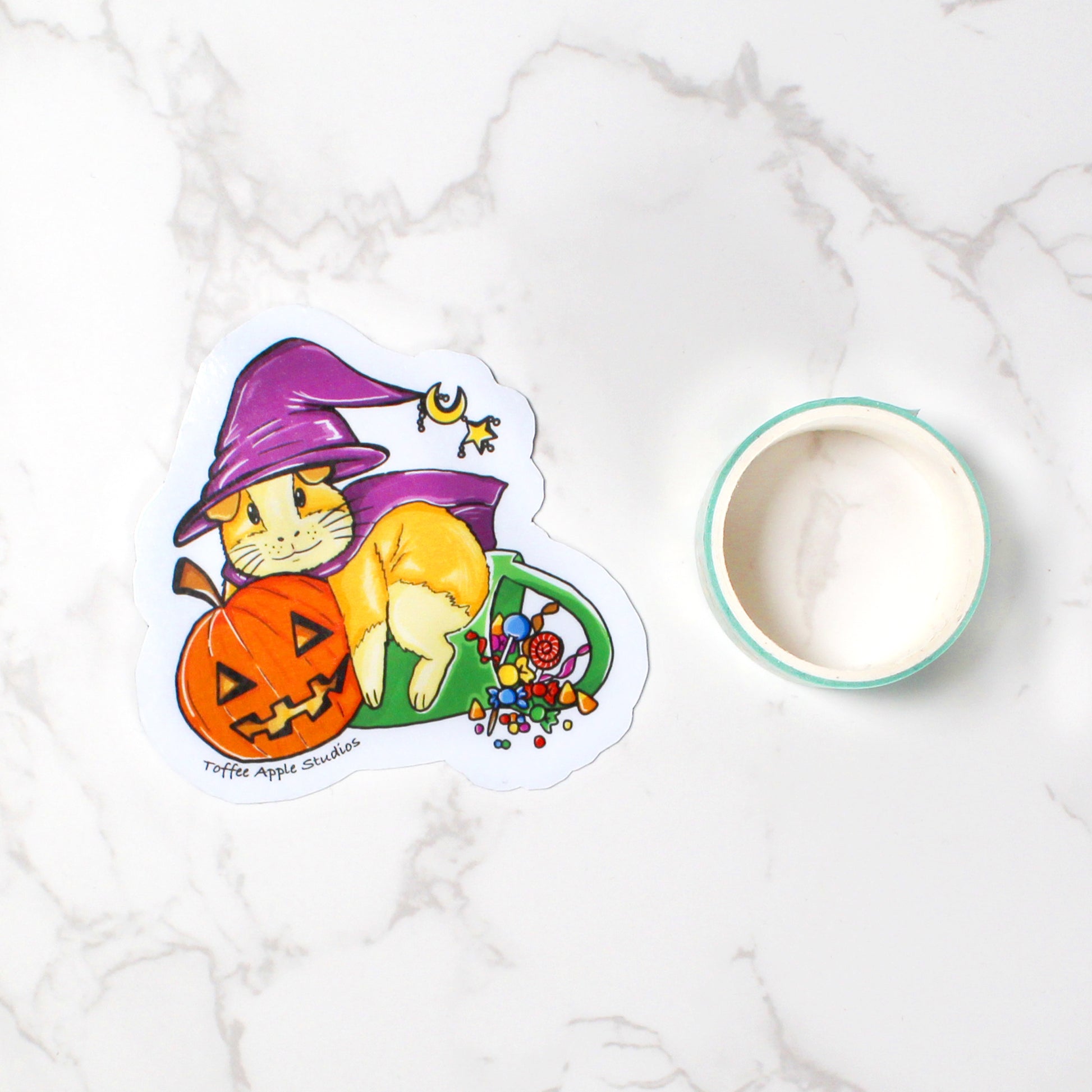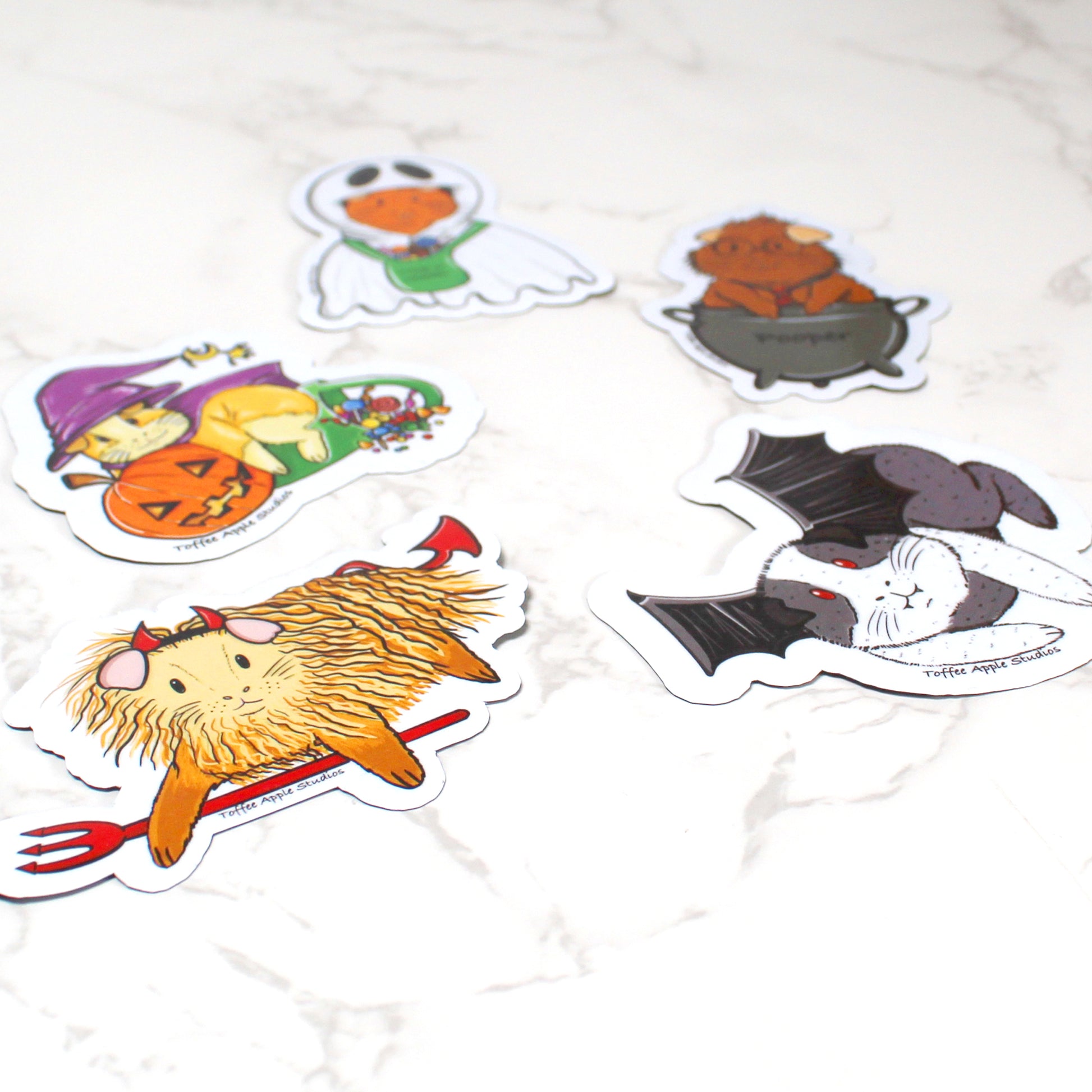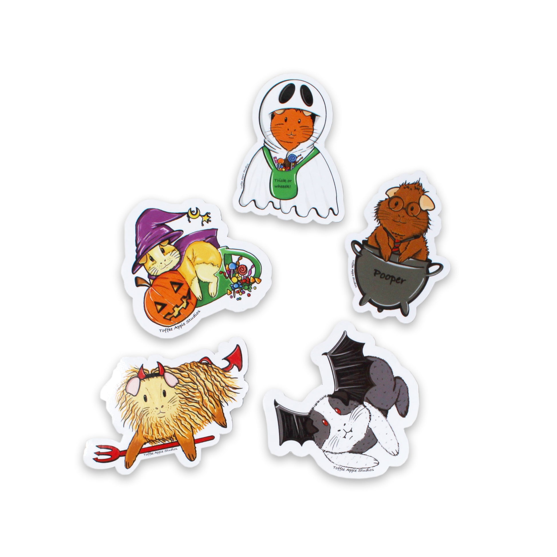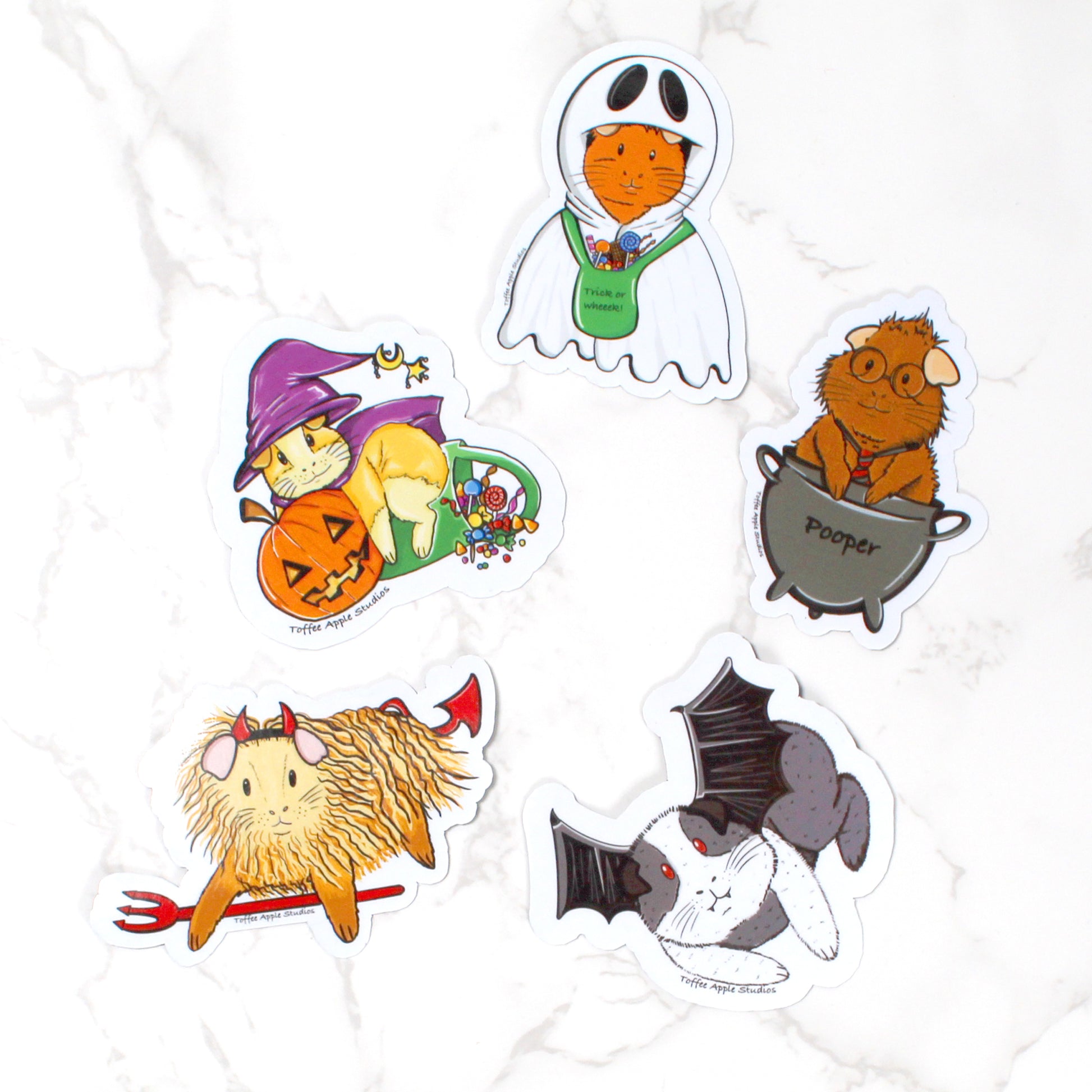 Illustration are of witchy guinea pig, devil guinea pig, ghost guinea pig, Harry pooper and bat-pig.