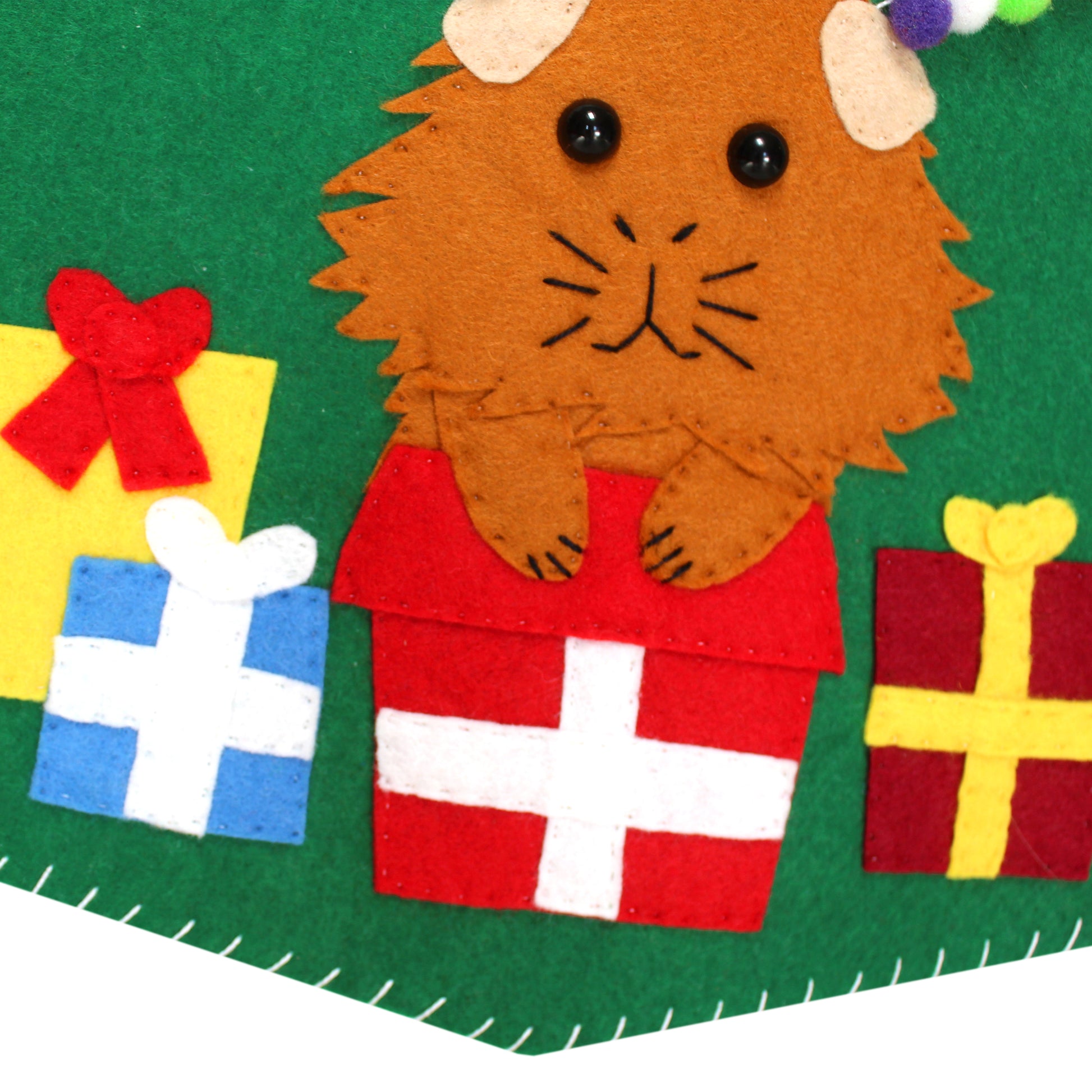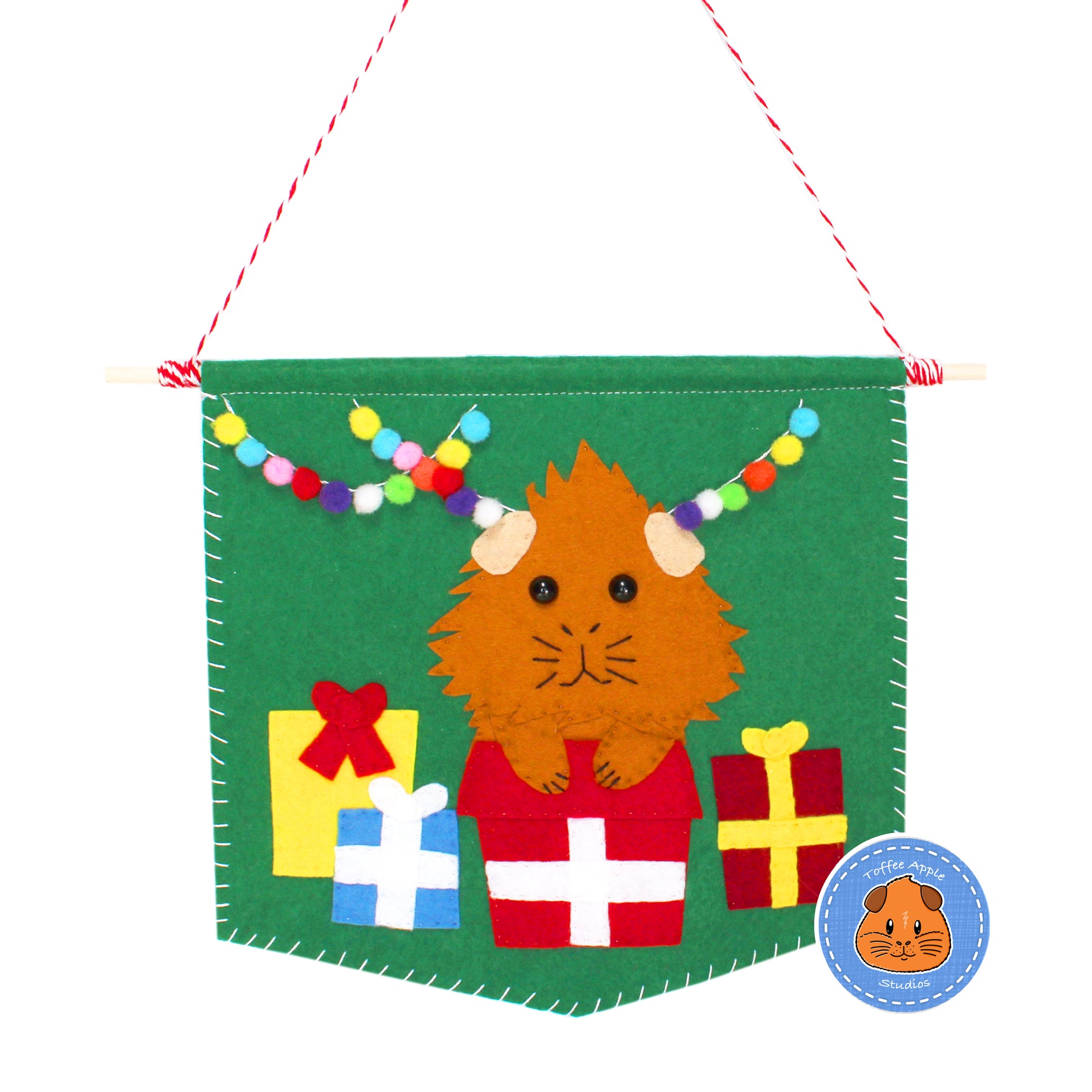 This adorable felt guinea pig in a Christmas present wall hanging decoration has been made from recycled / pre-loved felt so from purchasing this item you are making a sustainable choice by giving love once more for these materials.