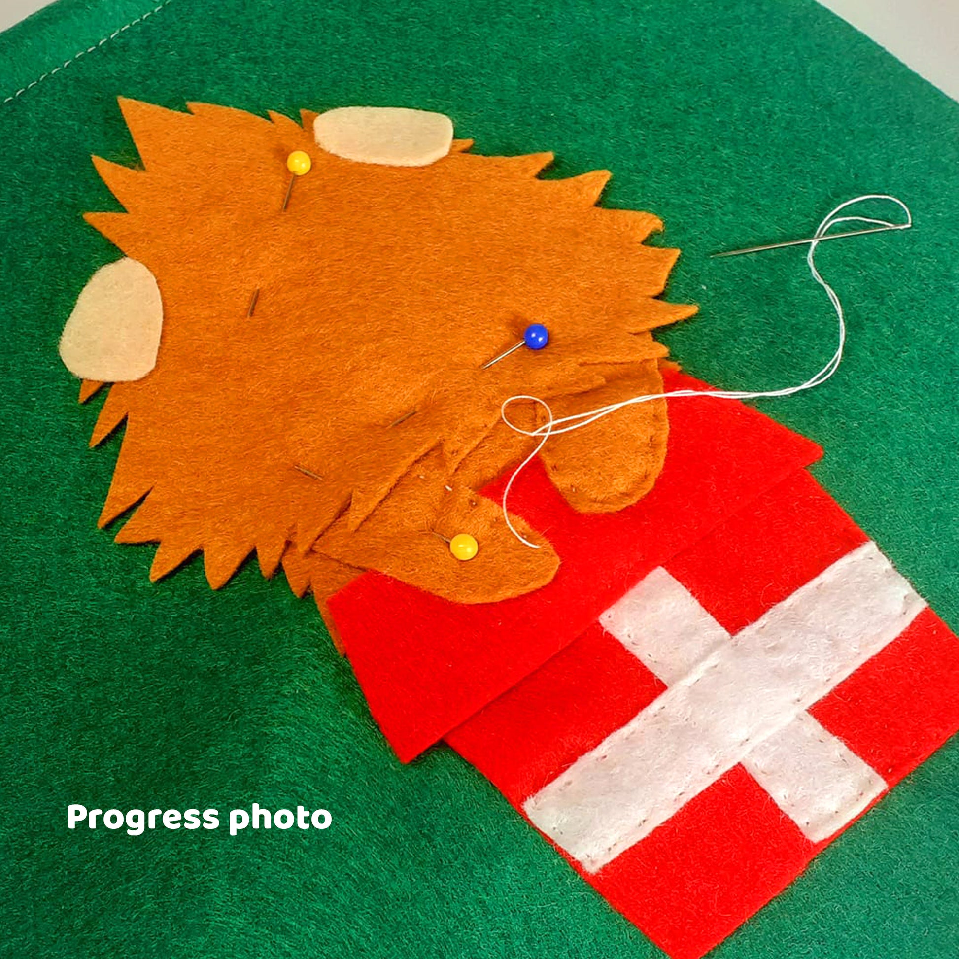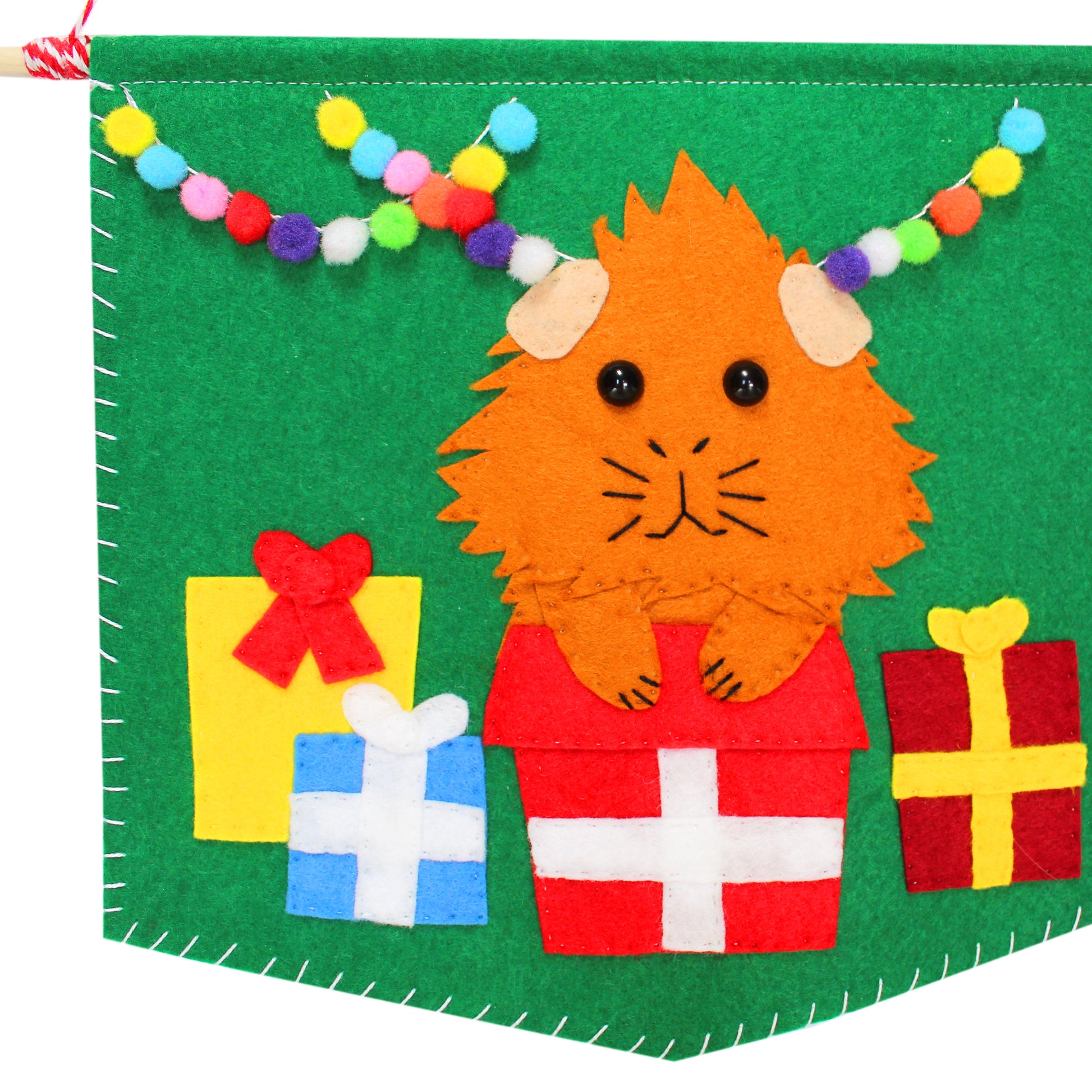 This felt 'Guinea Pig' on front has been hand cut out and sewn to the flag hanging. The ginger Guinea pig holding a strawberry design is made up of coloured felt pieces. The deep green flag has hand embroidered features and plastic eyes. The hanger is hung by candy cane rope on a natural wooden pole.