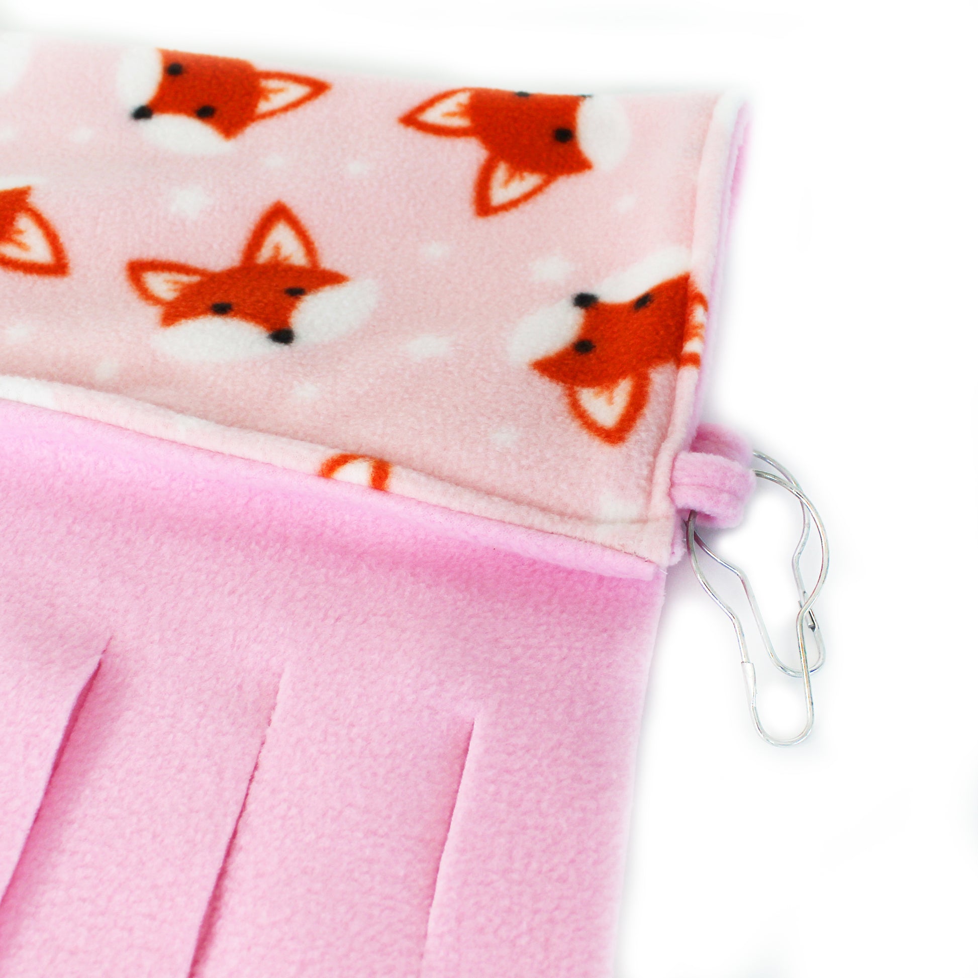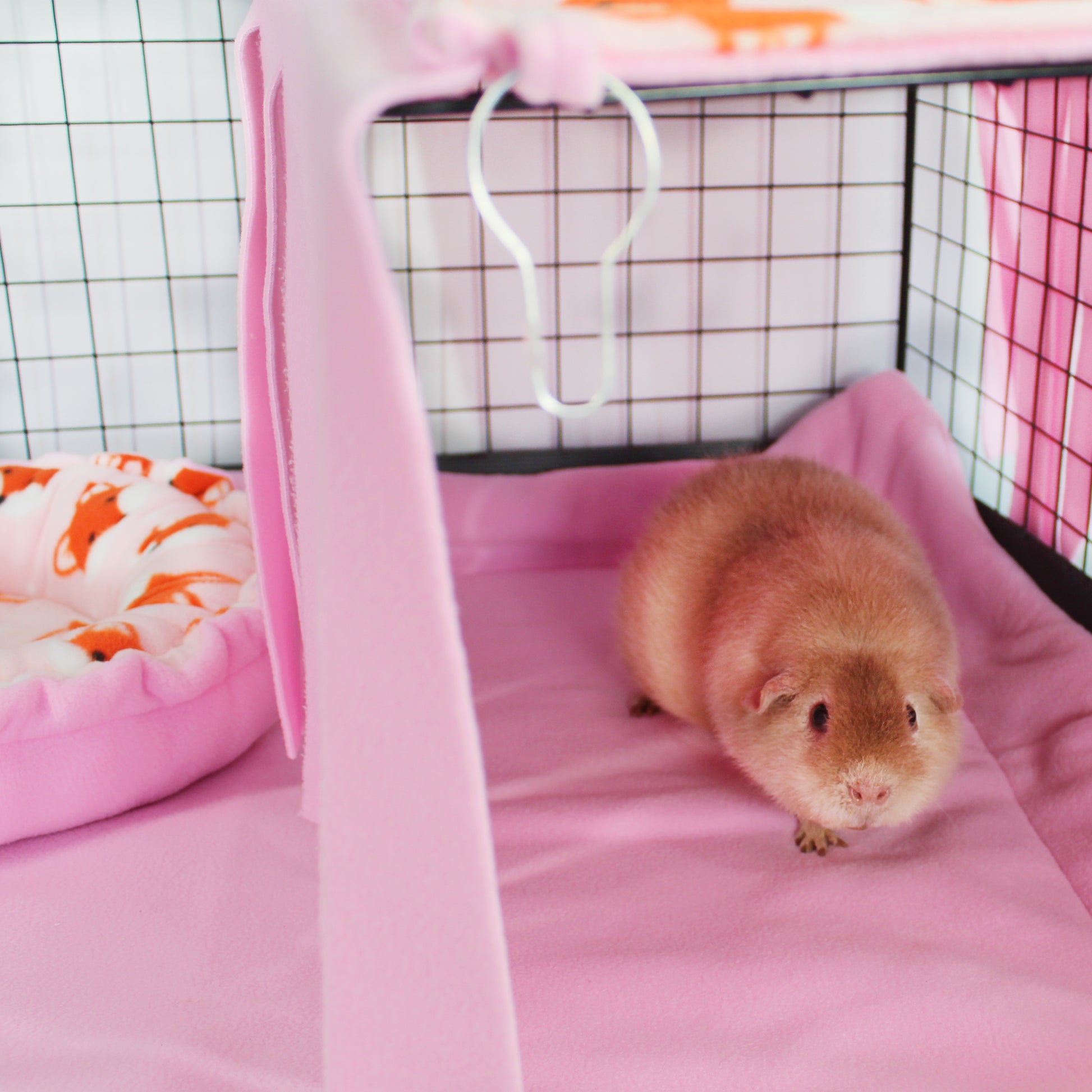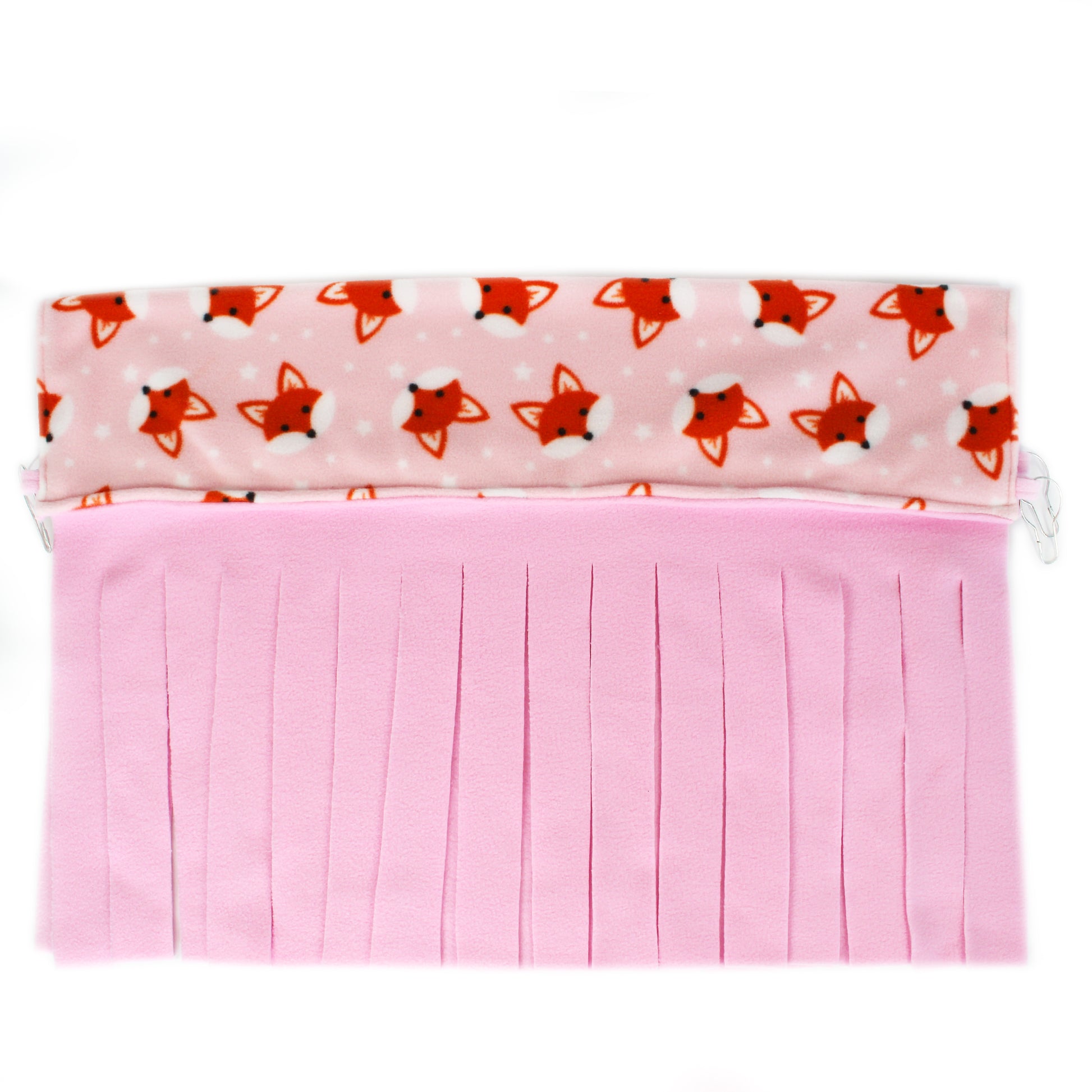 Our Large Foxy Fleece Forest is the ultimate fleece forest for guinea pigs, blending soft pale-pink anti-pill fleece topped with the cutest fox print. Featuring a luxury light-pink underside, sturdy attachment loops, and metal clips, this curtain hammock is machine-washable and handcrafted with guinea pigs at the heart of every stitch.