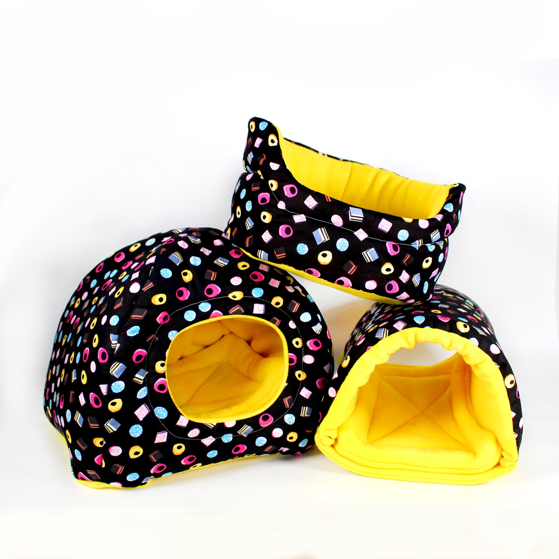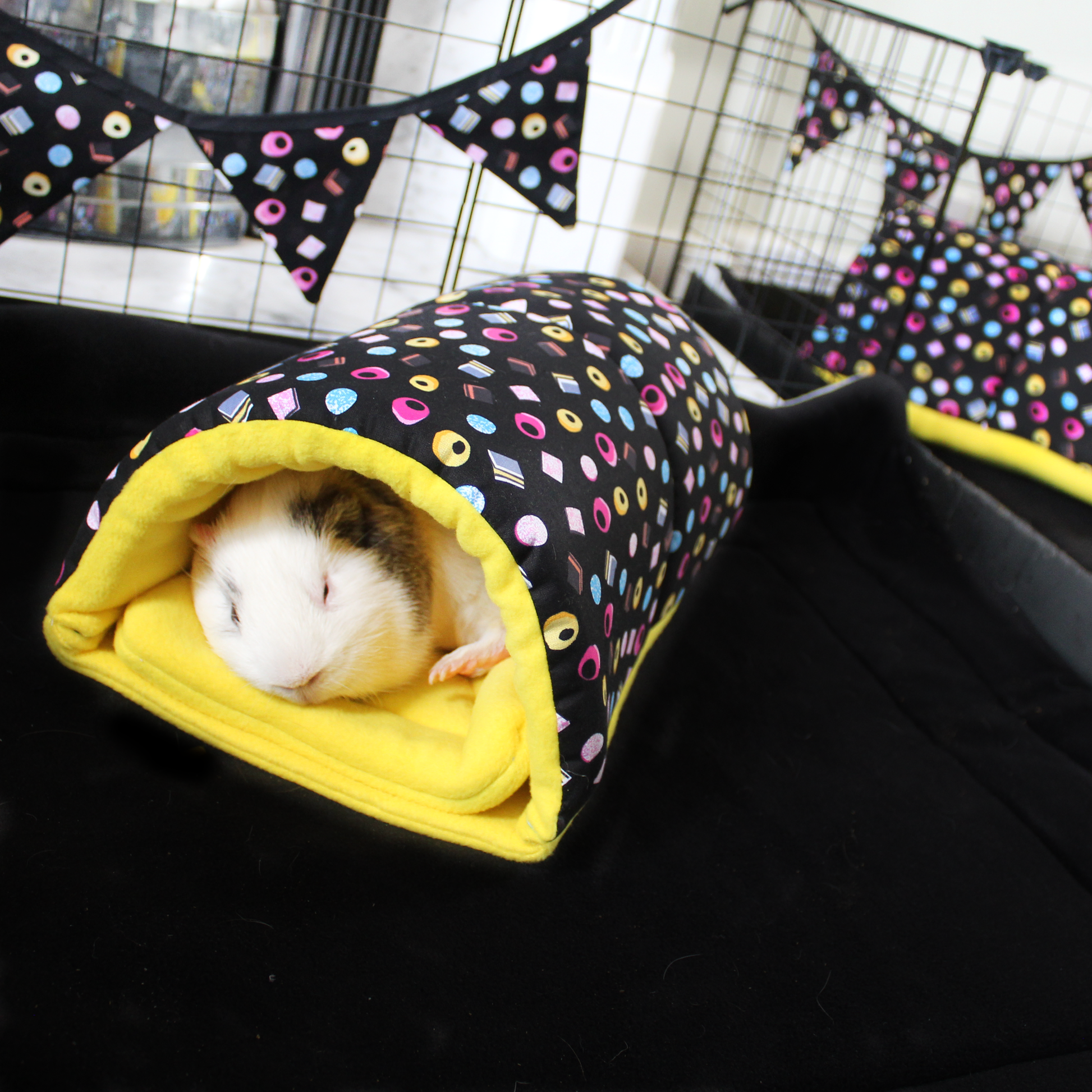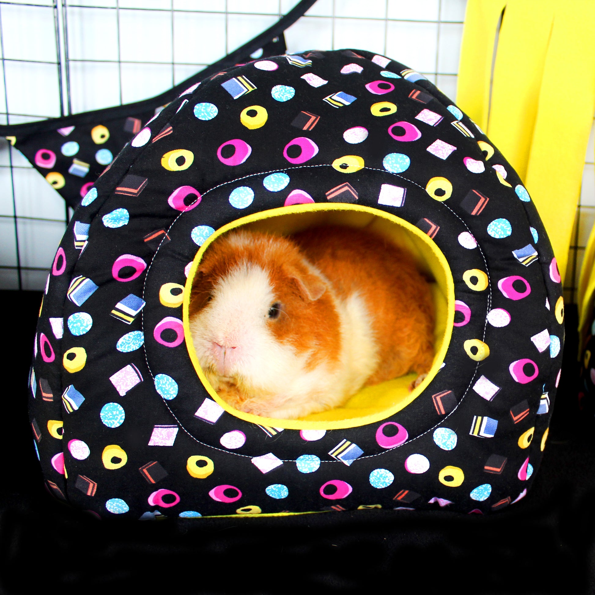 This accessory set is ideal for guinea pig owners who want a fun, matching set that offers comfort and style. The vibrant Liquorice Allsorts pattern adds a touch of whimsy, while the high-quality materials ensure your pets have a cozy place to sleep, hide, and play. Create a candy store-inspired enclosure that your guinea pigs will love!