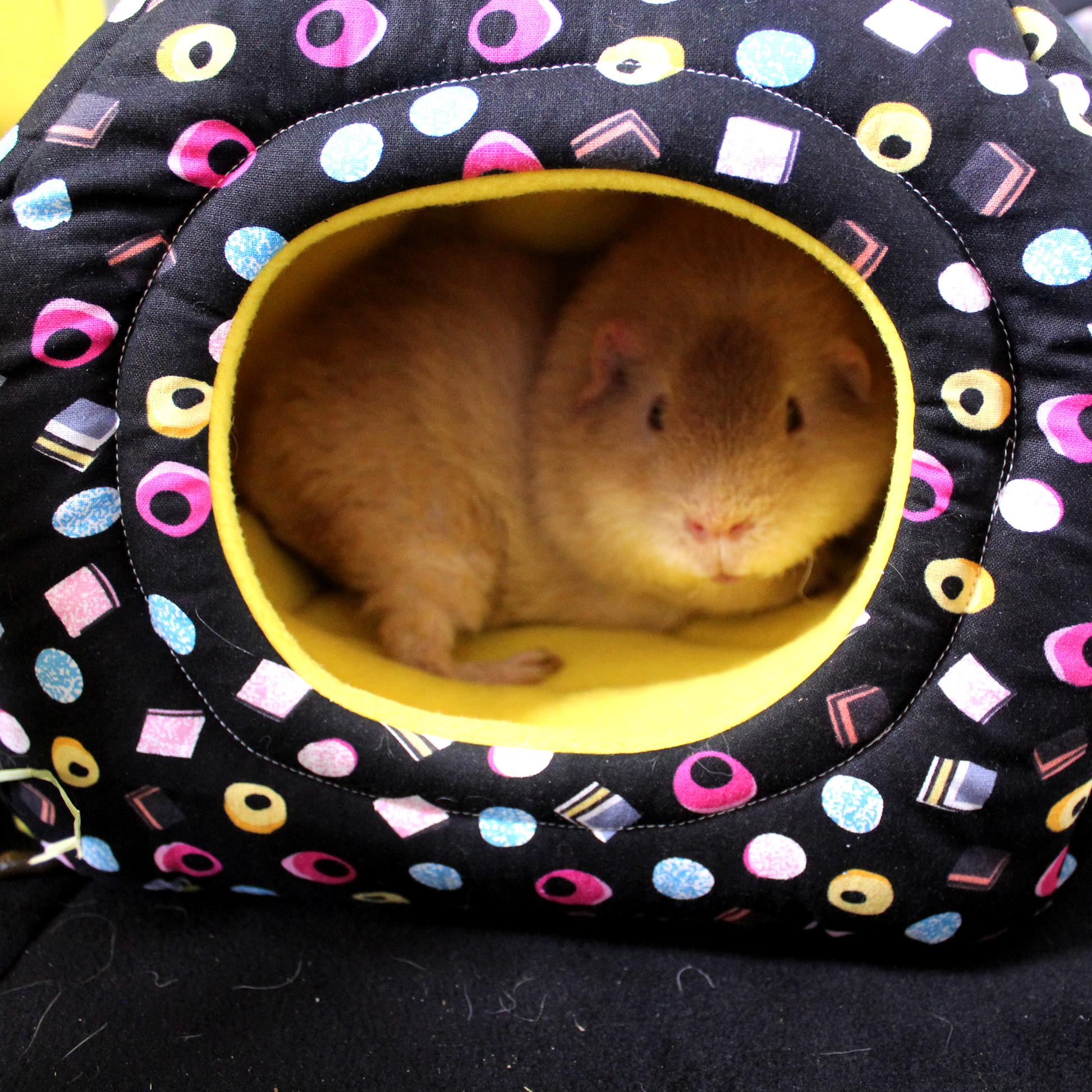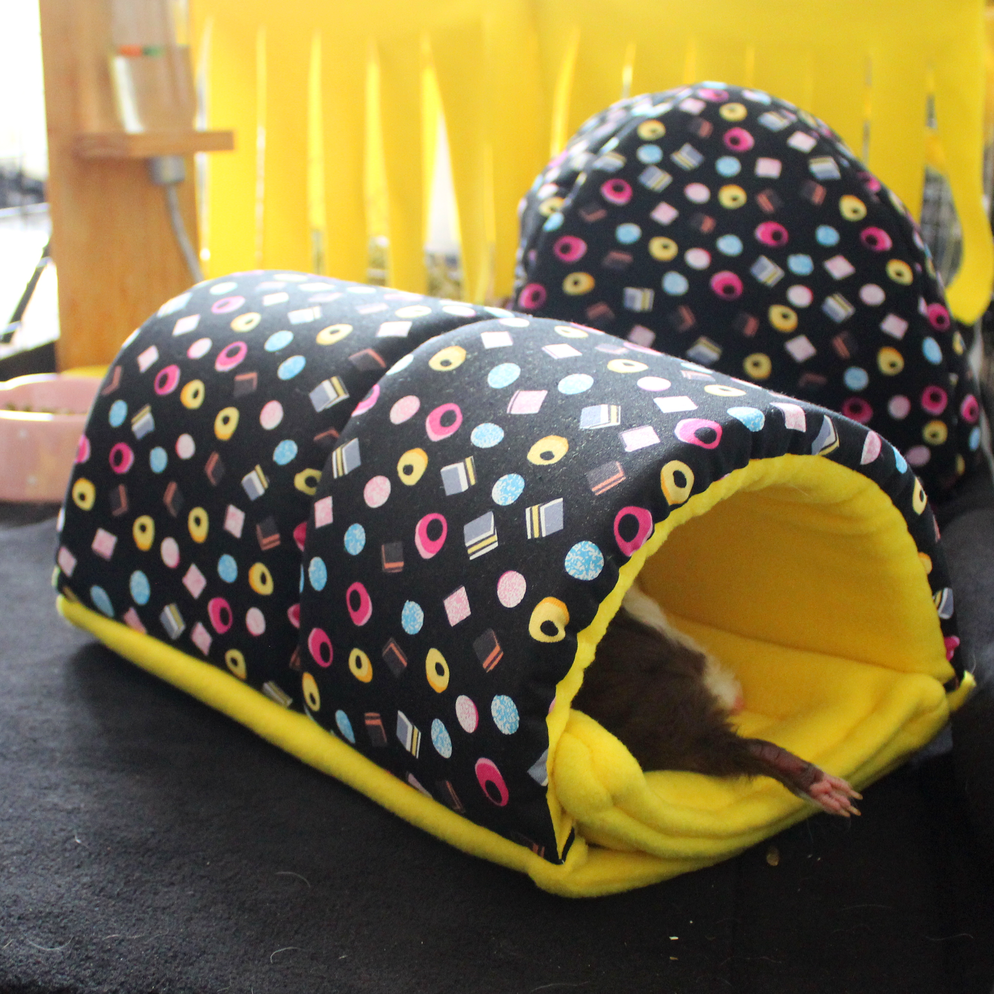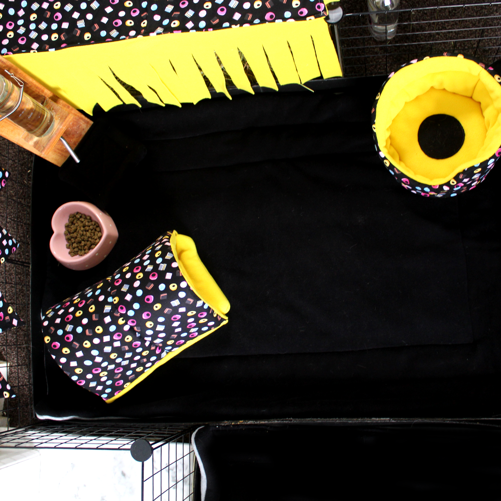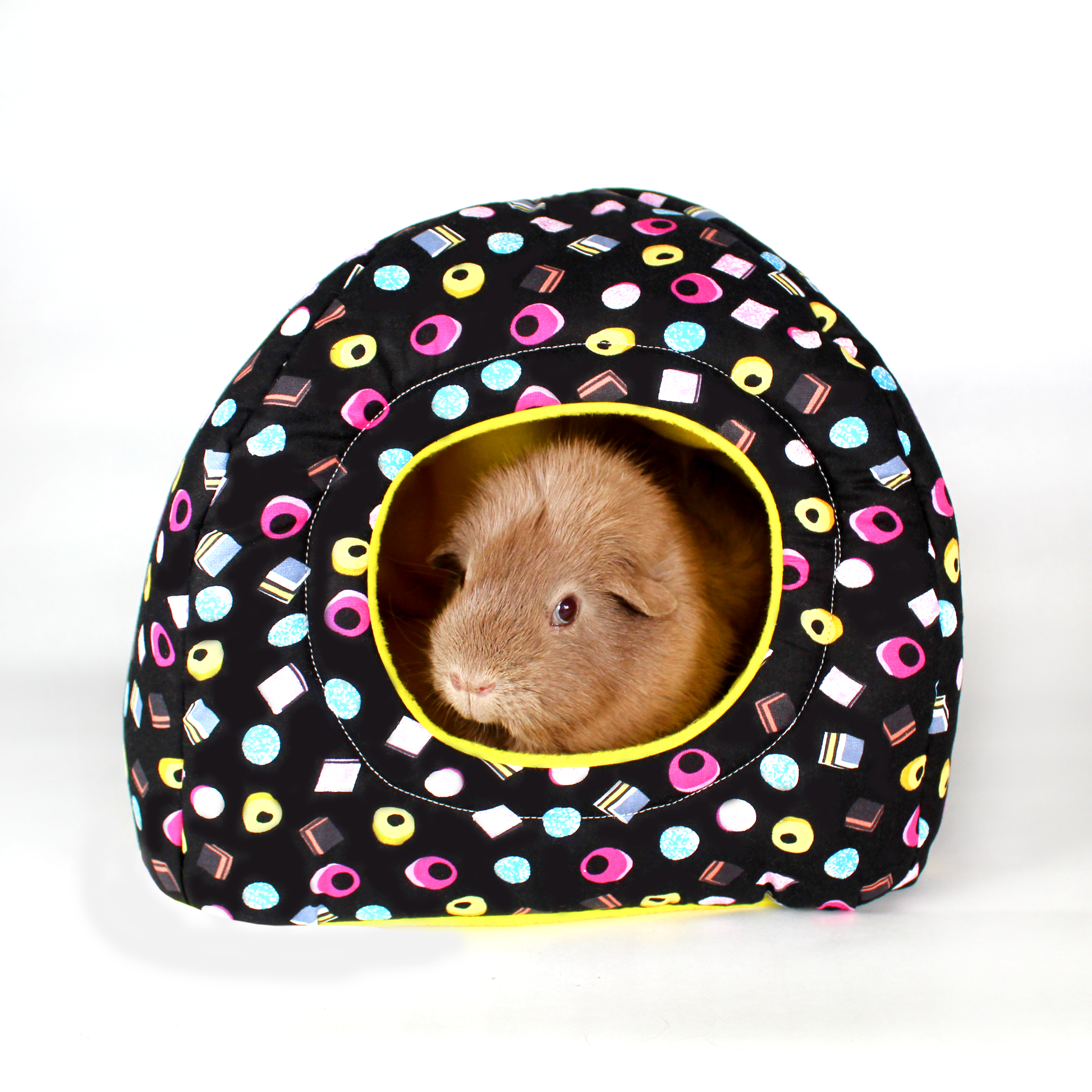 This accessory set is ideal for guinea pig owners who want a fun, matching set that offers comfort and style. The vibrant Liquorice Allsorts pattern adds a touch of whimsy, while the high-quality materials ensure your pets have a cozy place to sleep, hide, and play. Create a candy store-inspired enclosure that your guinea pigs will love!