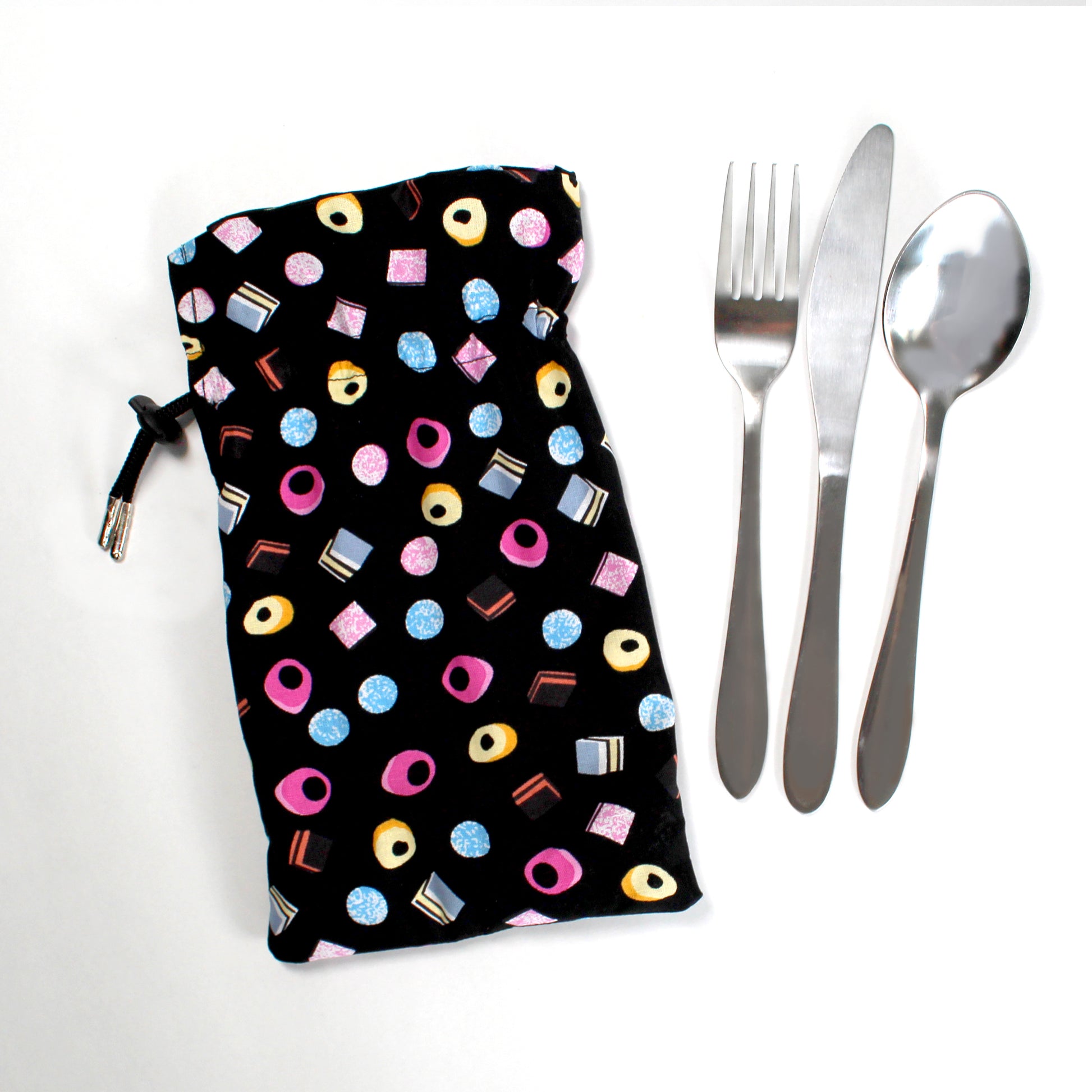 The Liquorice Allsorts Travel Cutlery Set is tailored for sweet and candy enthusiasts who want a stylish and practical dining solution while traveling. Whether you're at a picnic, camping, or simply on your lunch break, this travel cutlery set is your perfect companion. Encased in a pull string pouch, it’s easy to carry and ensures you always have a clean set of utensils at hand.