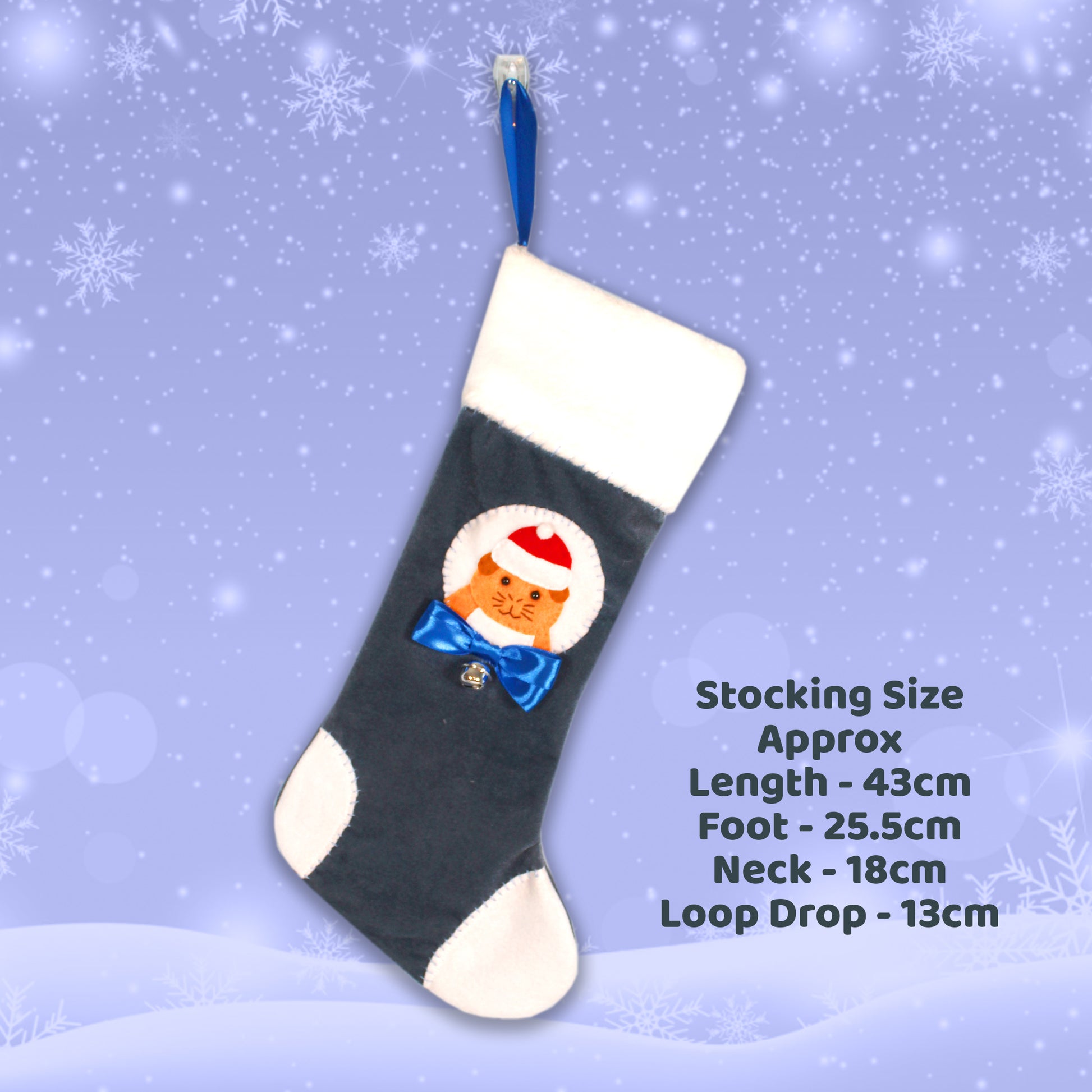 Handcrafted orange / ginger guinea pig Christmas stocking has been lovingly handmade with recycled luxury navy blue velvet fabric, white super soft cuddle plush fleece for the neck and white fleece for the feet tips.