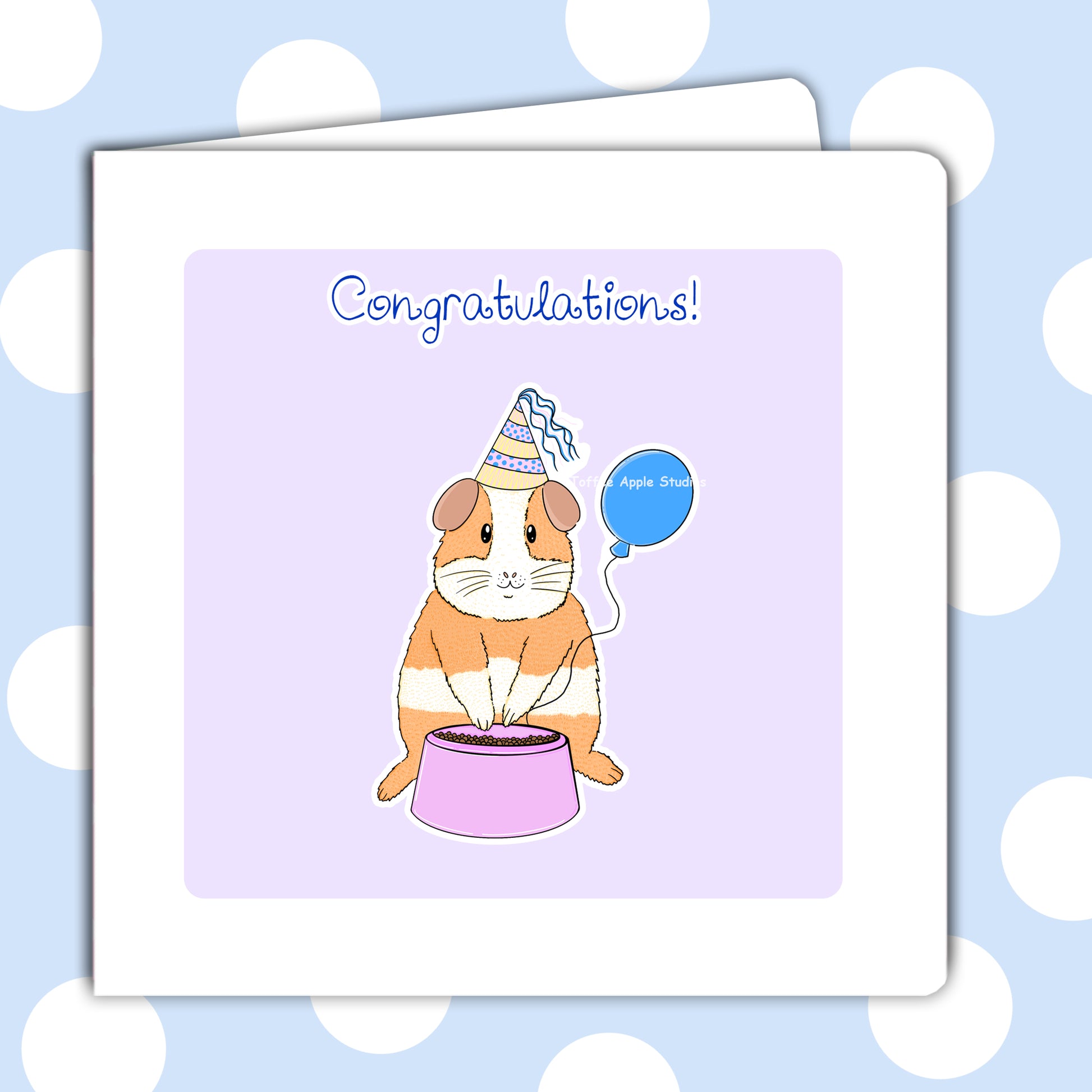 Guinea pig greetings card or can be personalised for any occasion (Front and inside text can be changed, just leave a note on your order). Made of quality white card-stock and a playful pastel design. Teacake one of our guinea pigs in real life is on her pink bowl waiting for cake with a party hat and balloon.