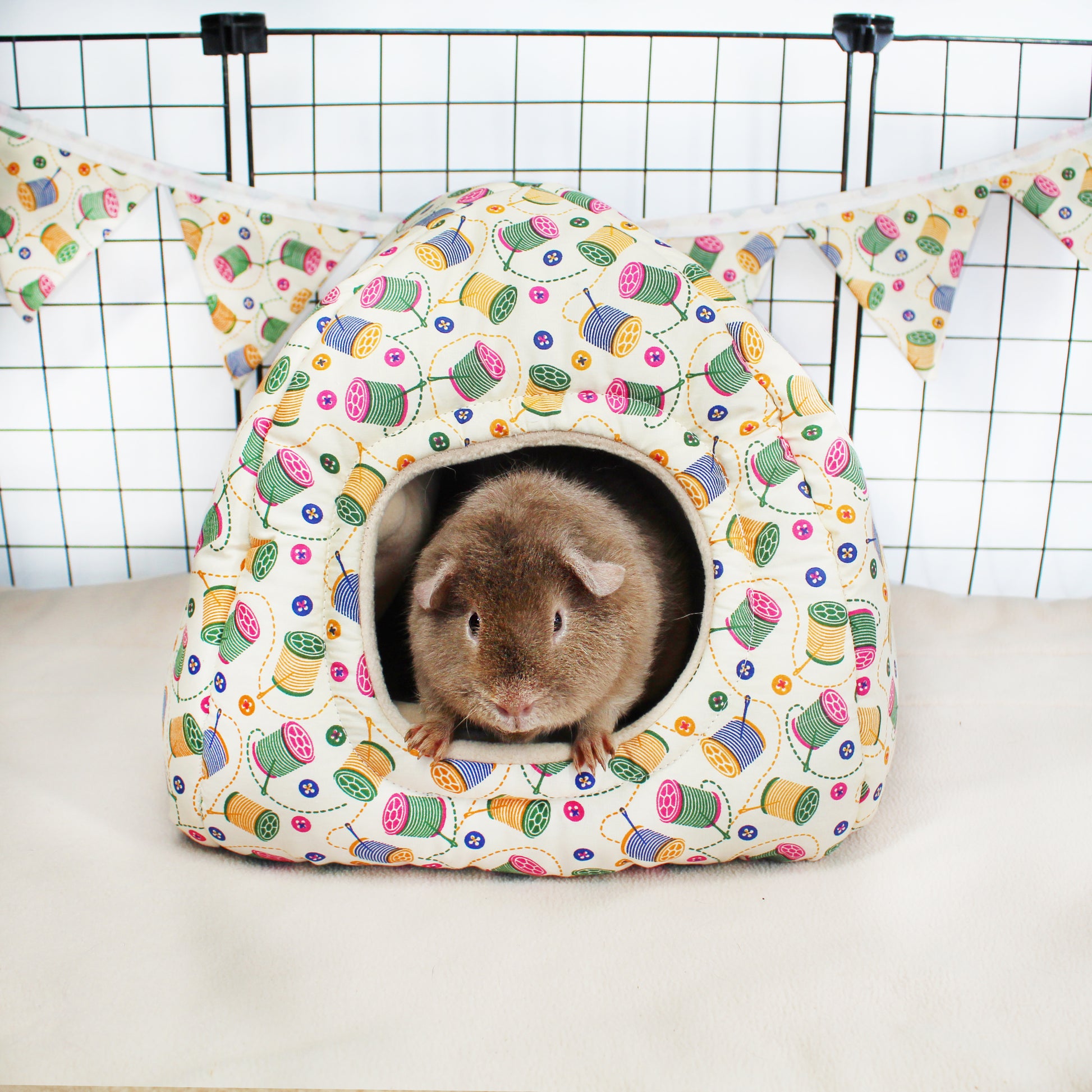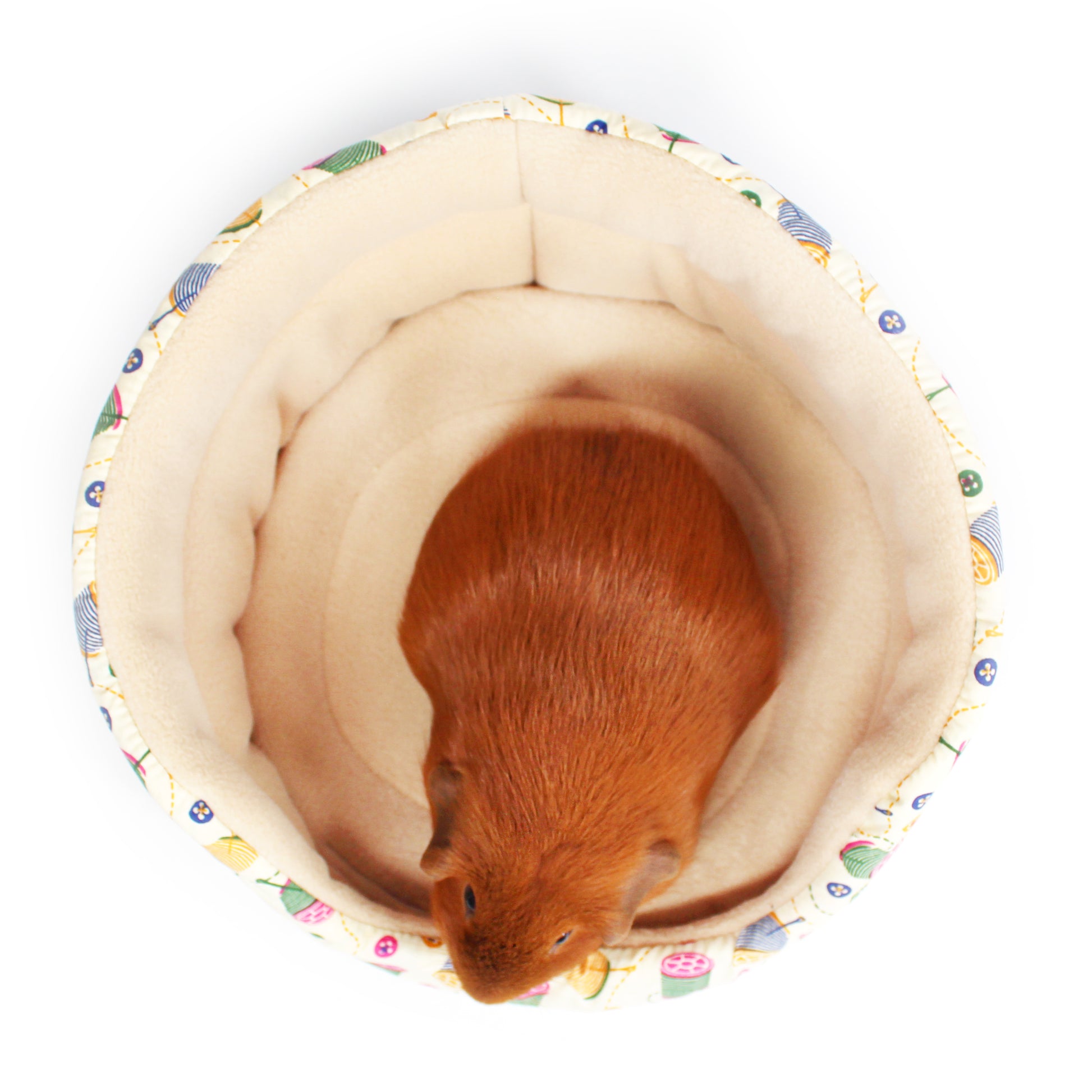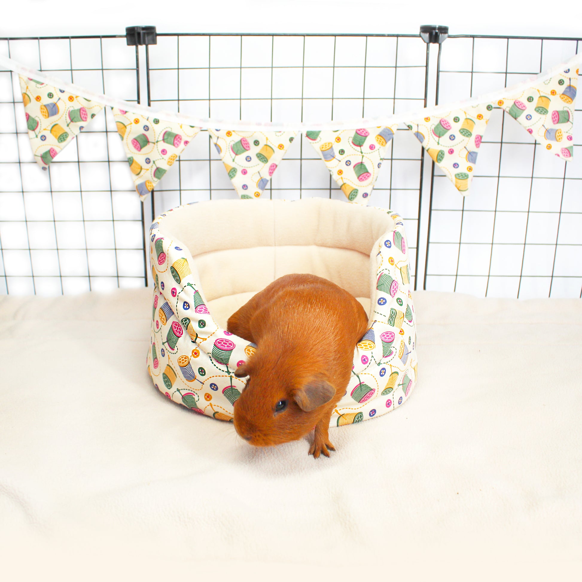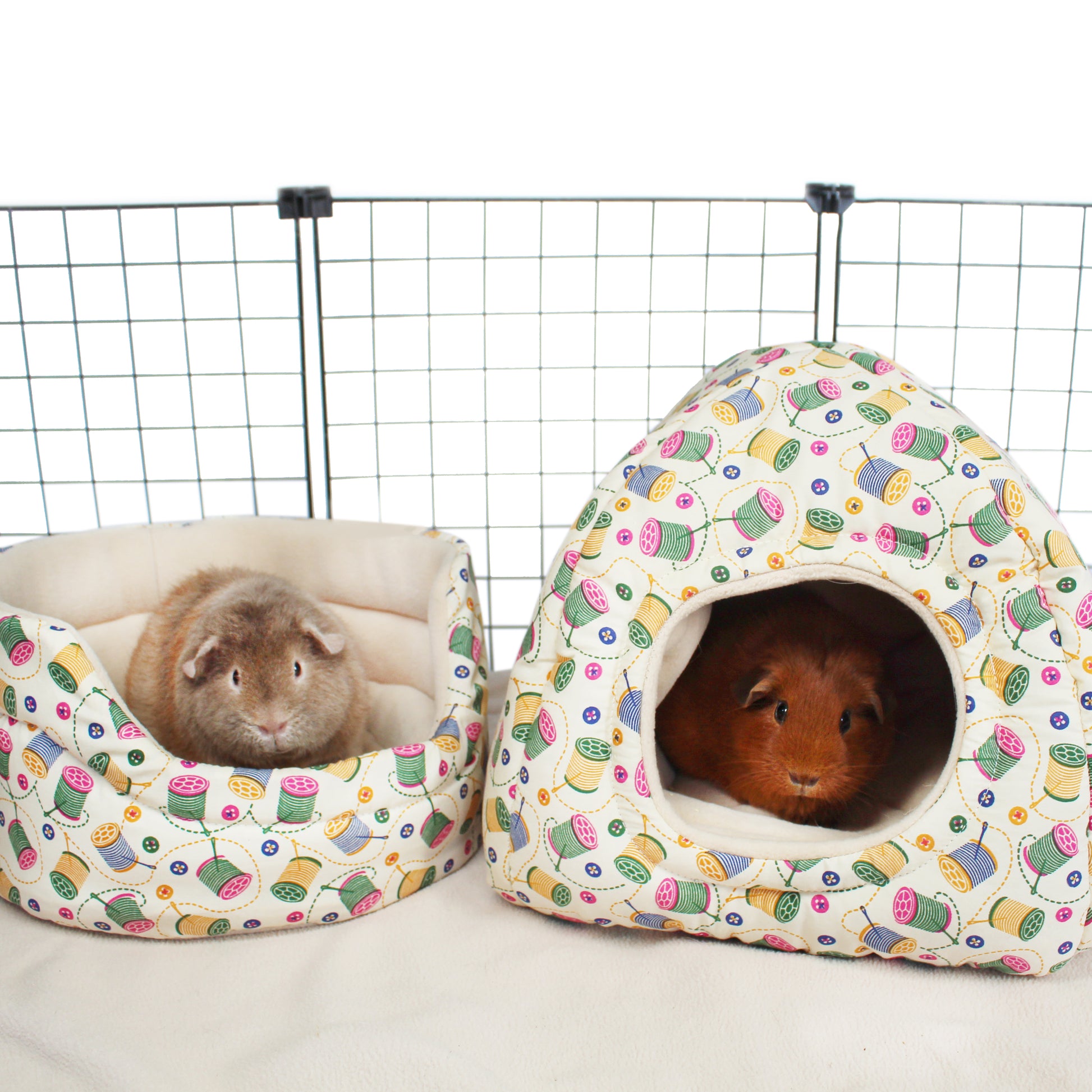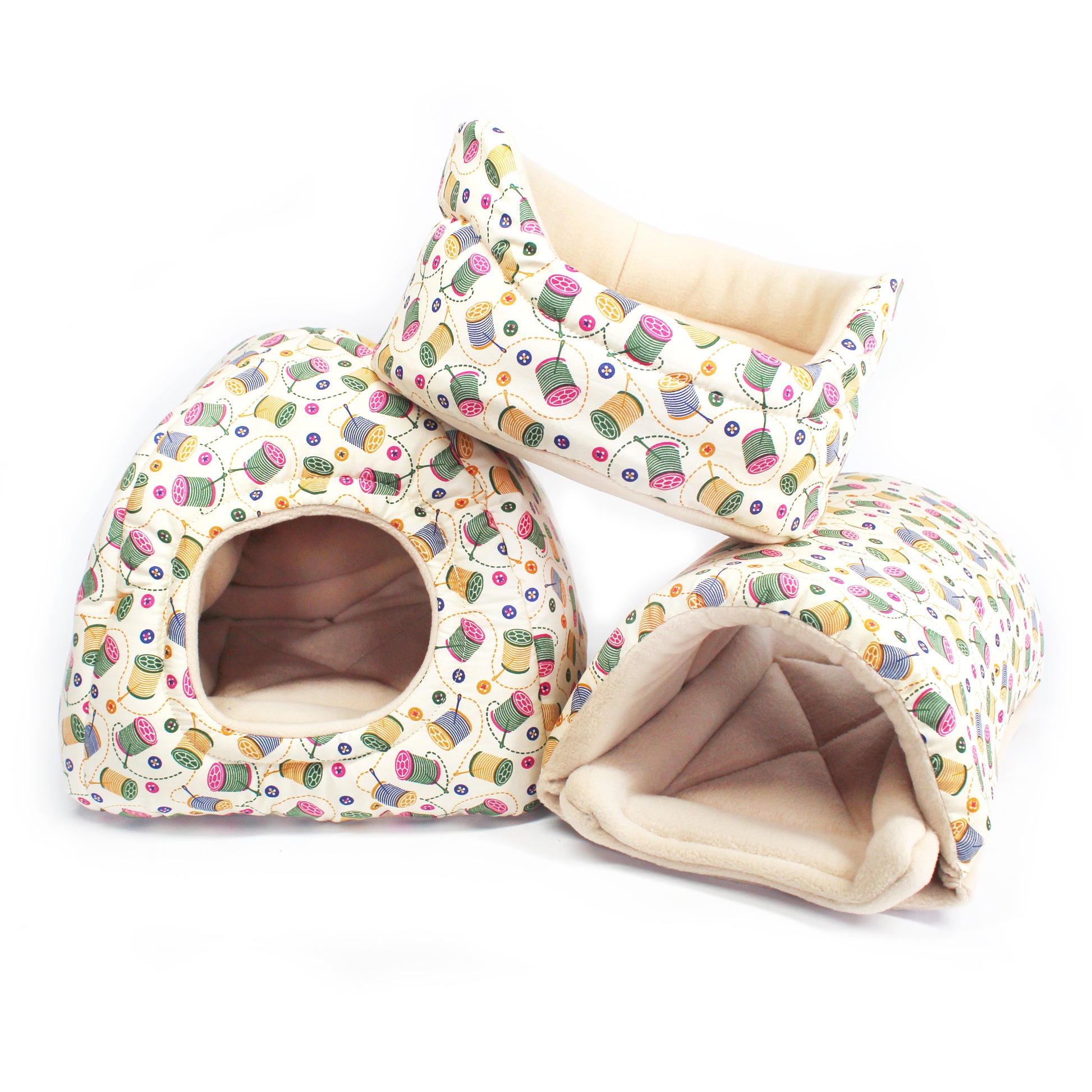 Looking to create a dream home for your guinea pigs and save money while you're at it? The Sew Sweet Guinea Pig Accessory Bundle is your all-in-one retro-chic solution for a stylish, snuggly, and coordinated cage setup. Featuring a charming beige cotton outer adorned with spools, buttons, needles, and thread, this limited-edition set is as pretty as it is practical.