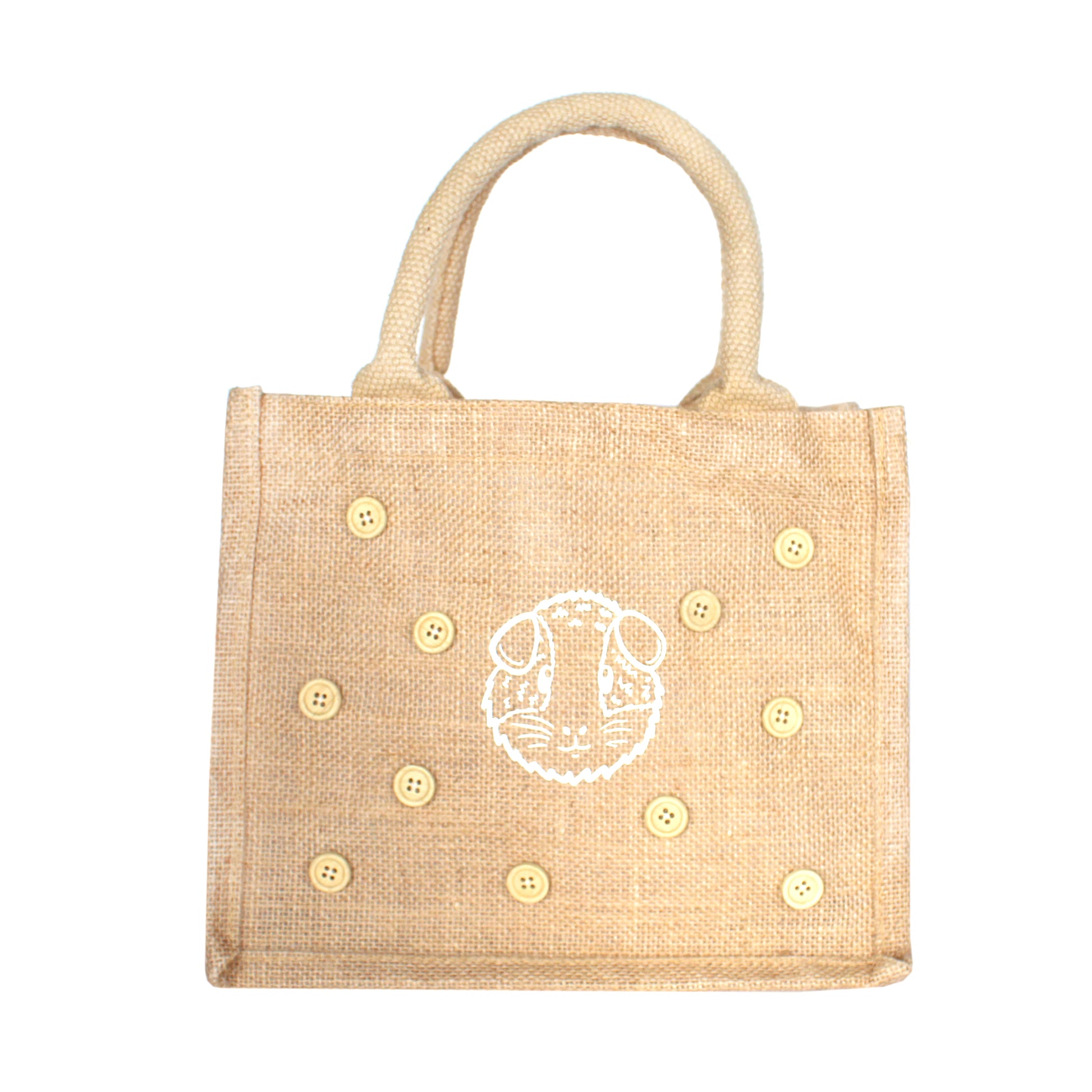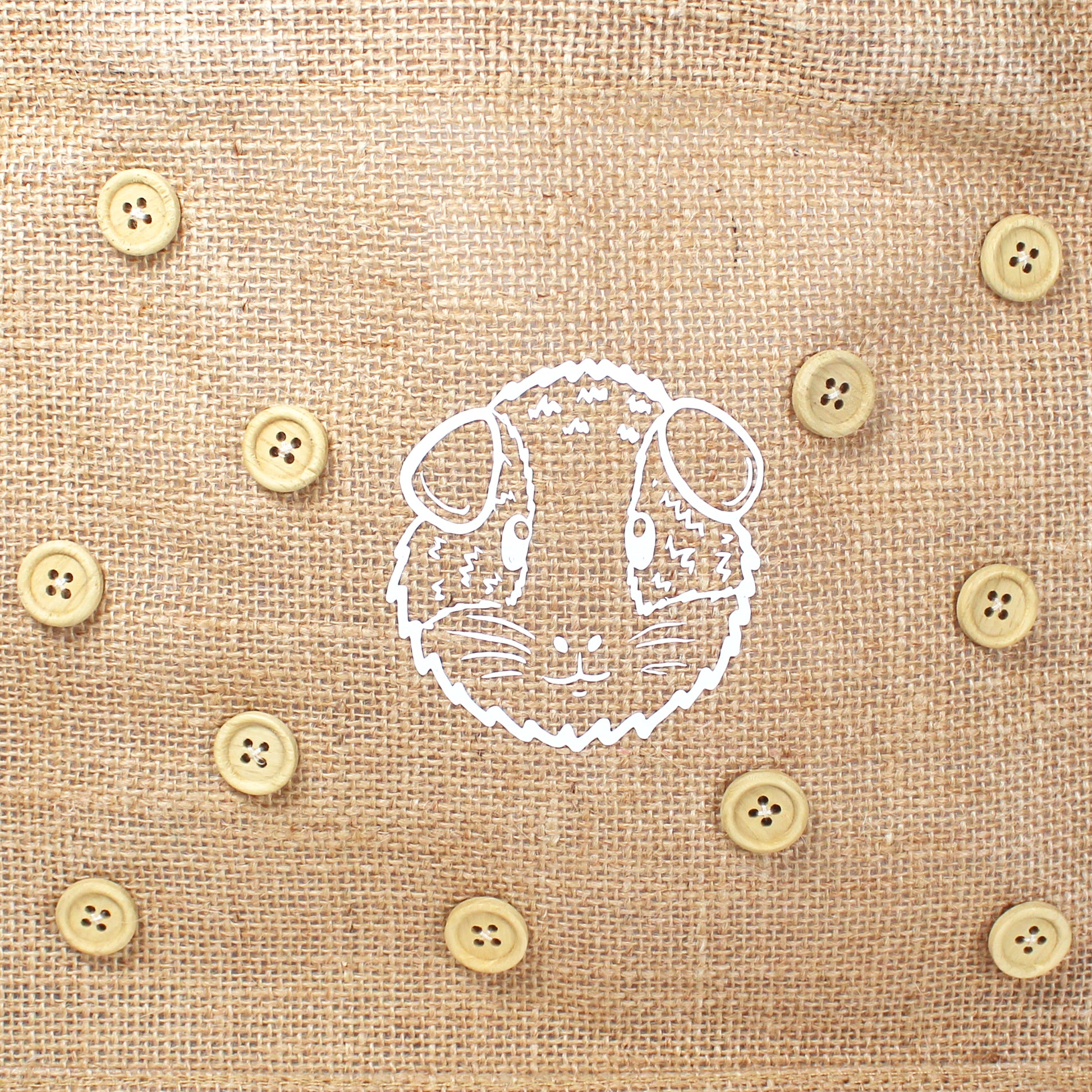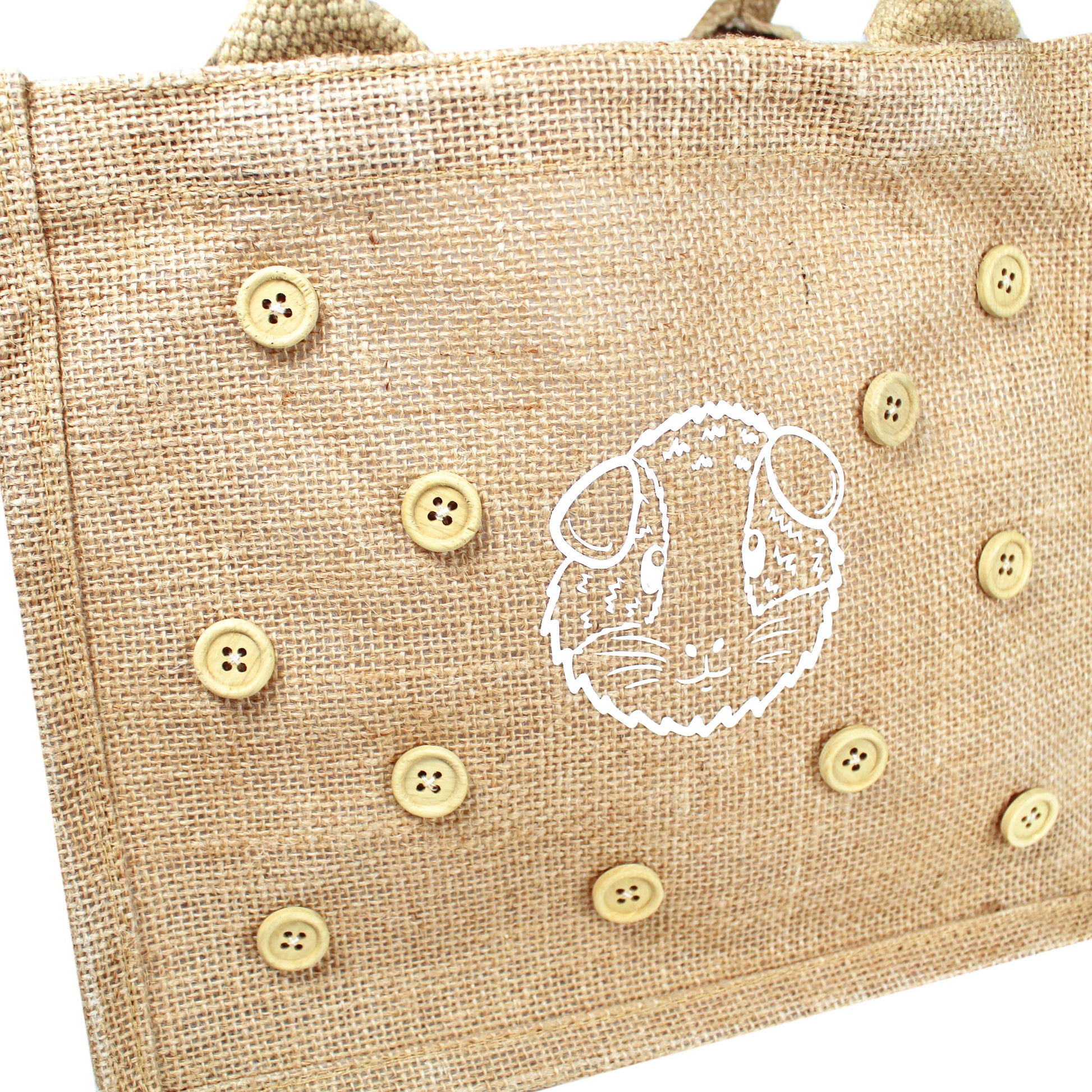 This lovely small jute shopping bag is featuring one of our own cute guinea pig illustrations and has been hand-pressed in our studio. We added these adorable wooden wooden button embellishments.