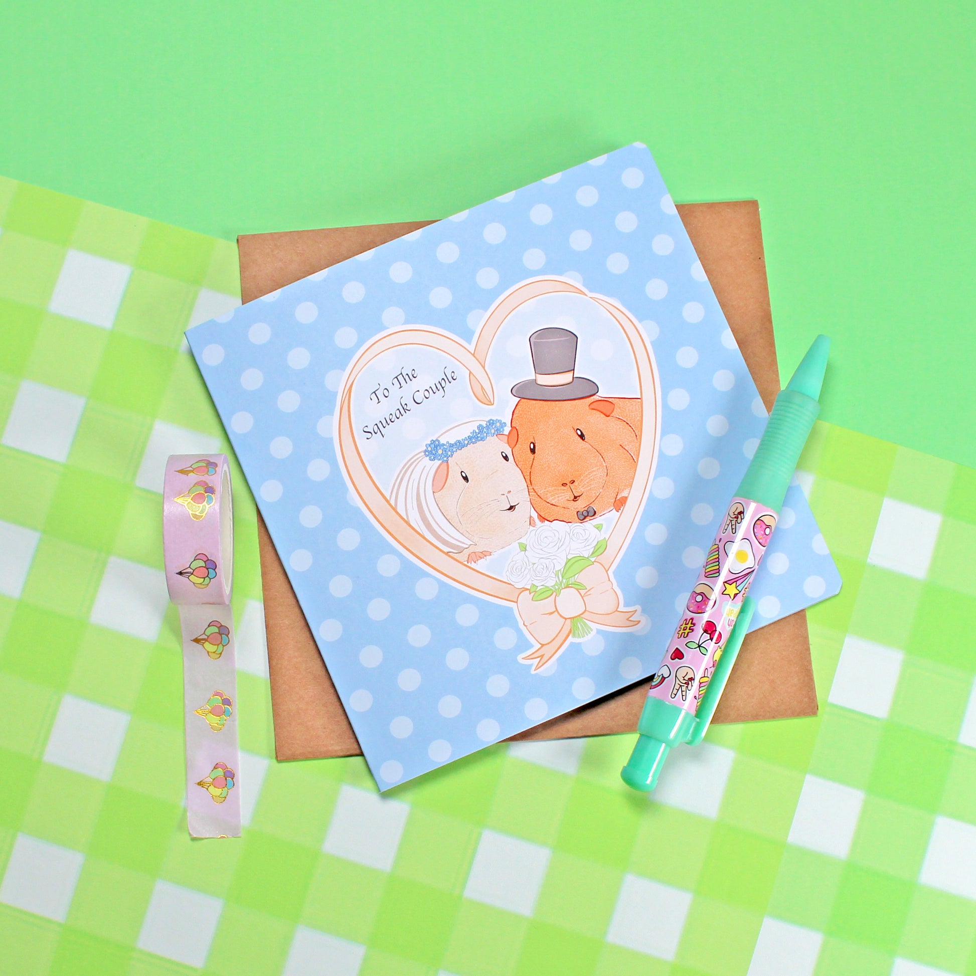 This adorable 'To the Squeak Couple,' guinea pig couples greeting card will have you pop-corning in delight at the colourful design.
